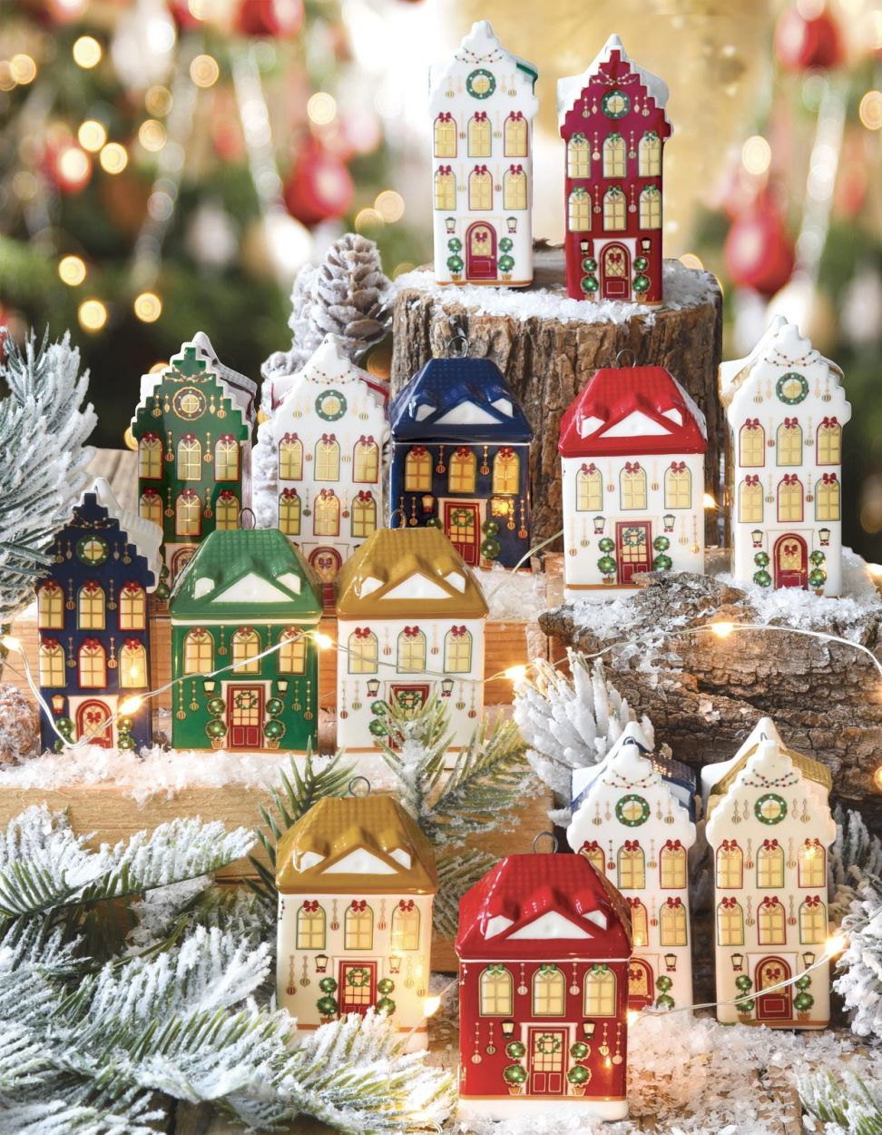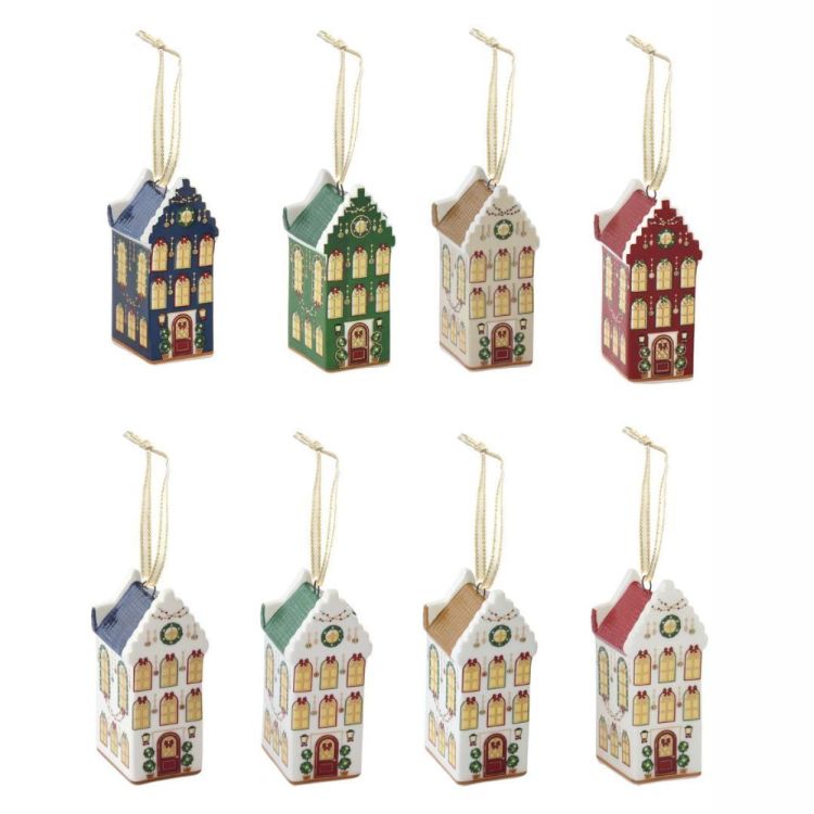 Kerstdecoratie in keramiek in de vorm van een kersthuisje, met fijne details en zachte kleuren.