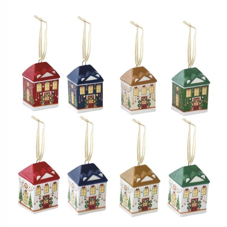 Kerstdecoratie in keramiek in de vorm van een kersthuisje, met fijne details en zachte kleuren.