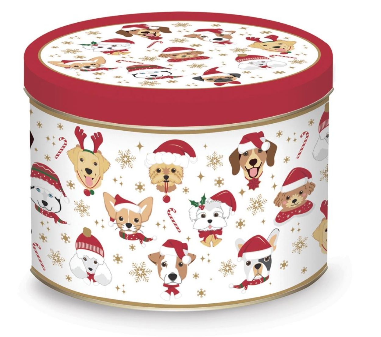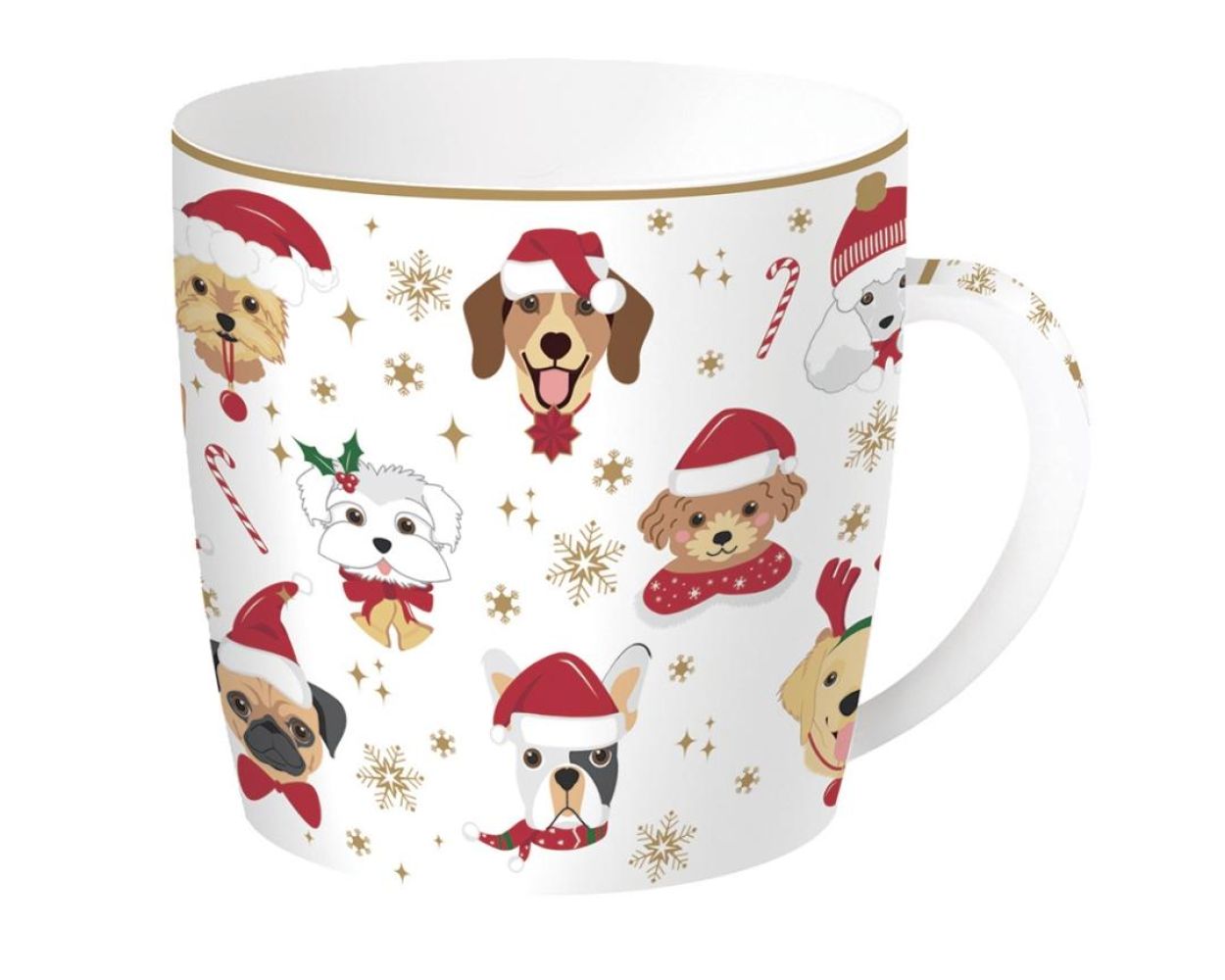 Porseleinen mok van 350 ml, versierd met vrolijke honden in kerstsfeer. Wordt geleverd in een bijpassende blikken koekjesdoos – ideaal om nadien te vullen met lekkers of als opbergdoosje te gebruiken.