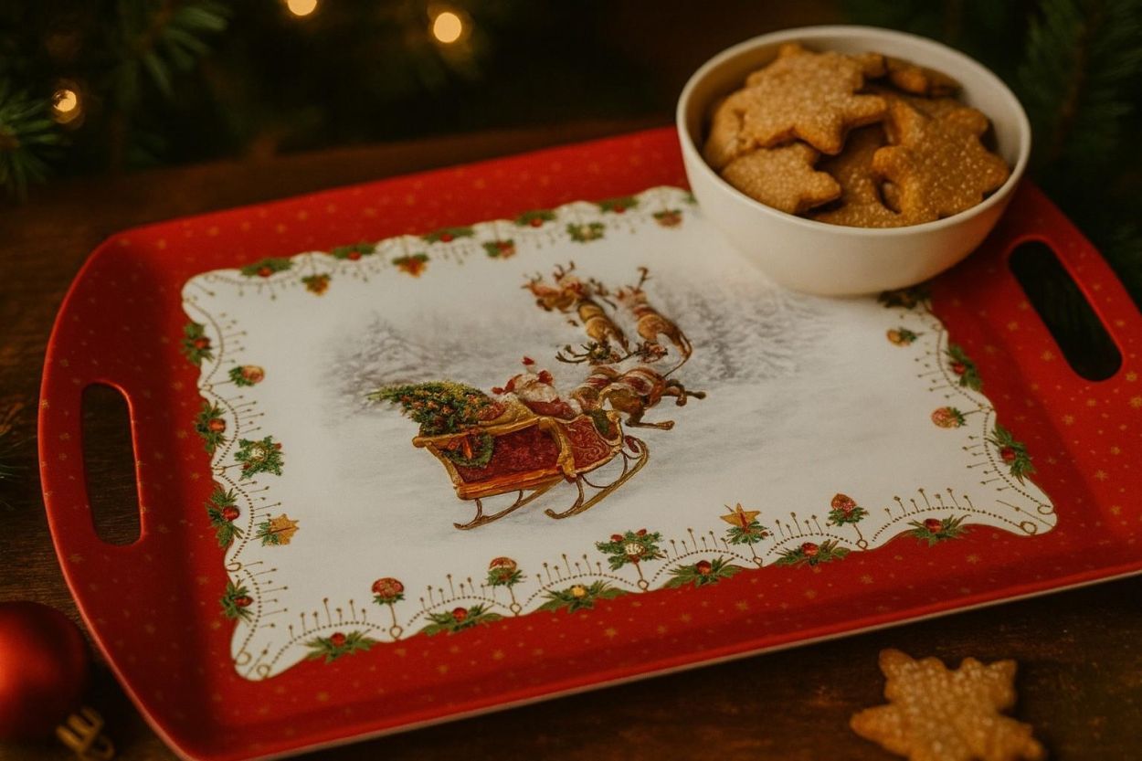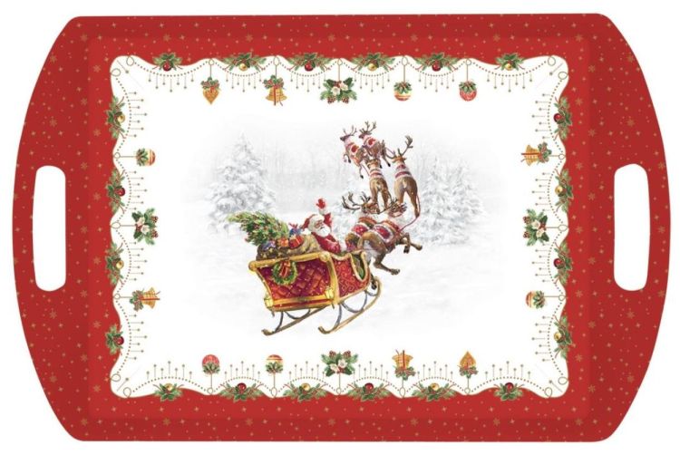 Grote en stevige serveerplateau in melamine, met feestelijk kerstdesign. Met zijn formaat van 52 x 35 cm is het ideaal om hapjes, glazen of dessertjes te presenteren tijdens de feestdagen.