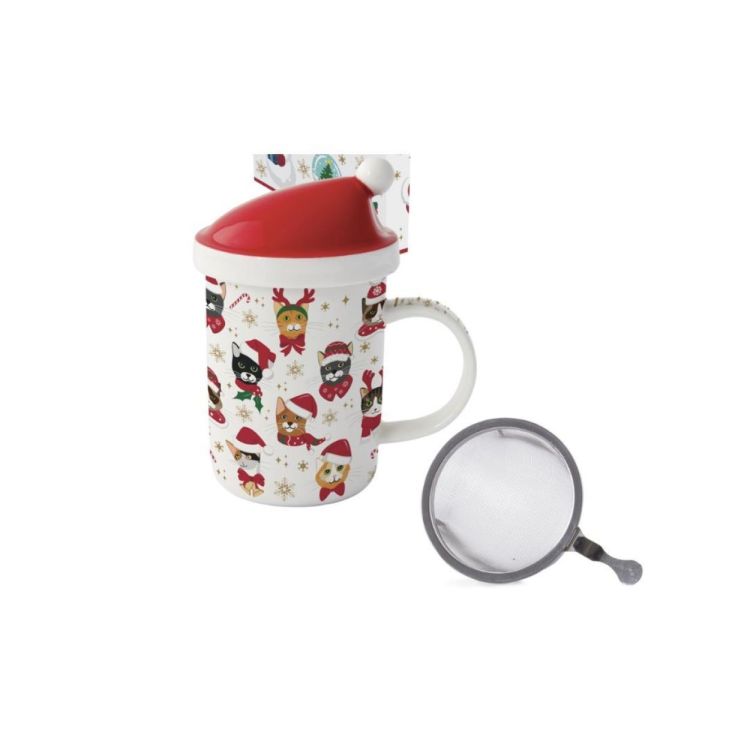 Porseleinen theetas van 450 ml, met metalen filter en een uniek deksel in de vorm van een rode kerstmuts. Het dekseltje houdt je thee langer warm en zorgt voor een vrolijke toets aan tafel.