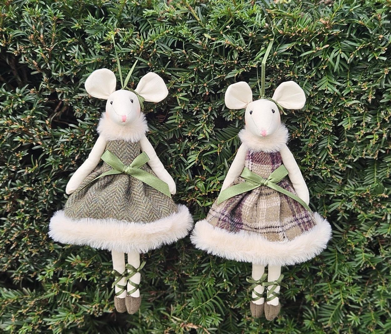 Sierlijke ballerina muis in een groen jurkje – een charmante hanger die direct kerstsfeer toevoegt.