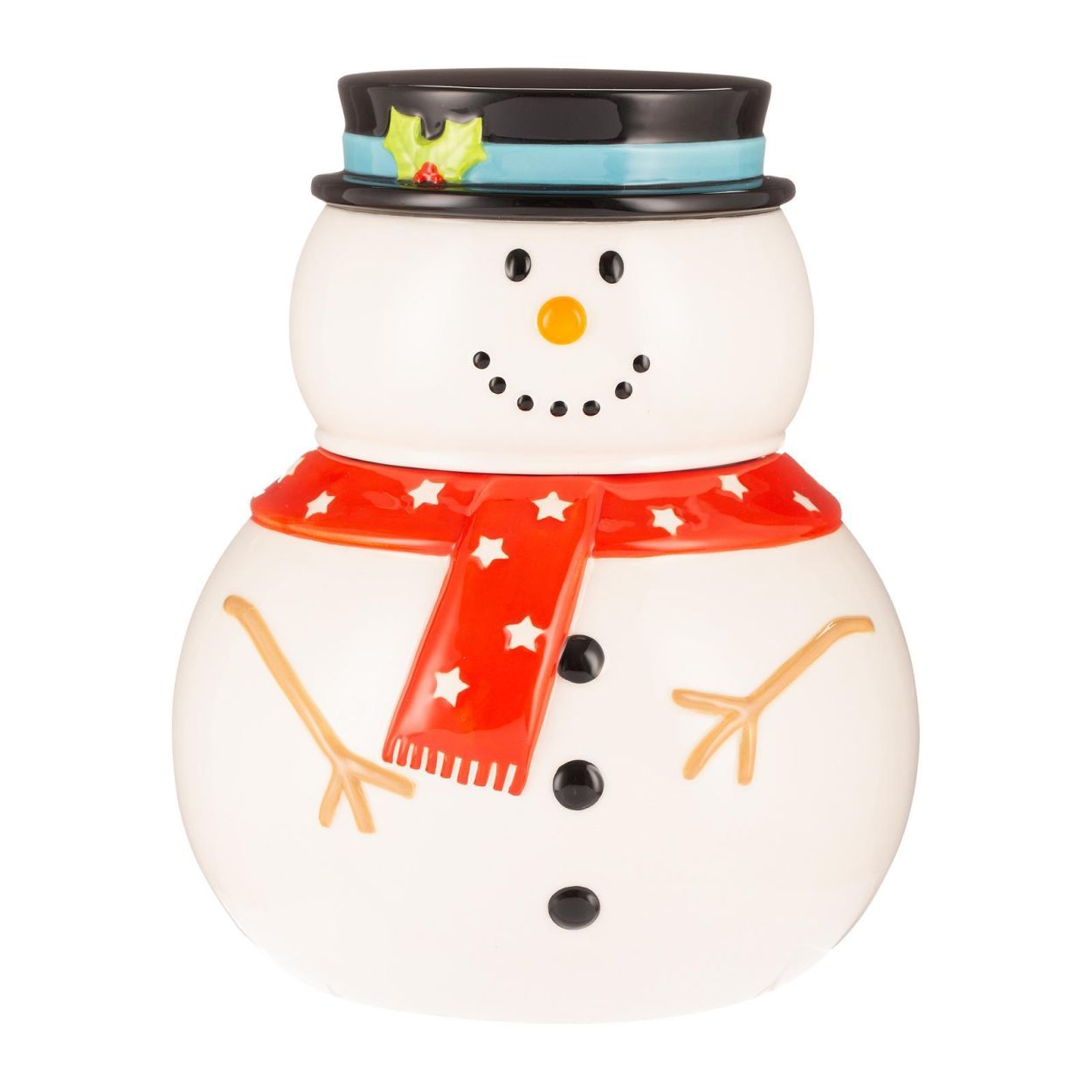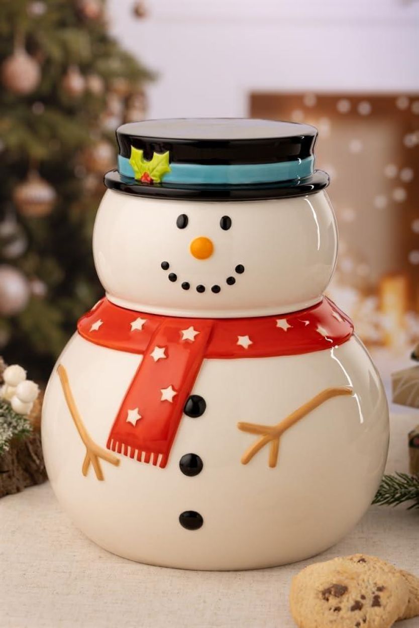 Een vrolijke koekjespot die je keuken meteen in wintersfeer hult. De handbeschilderde sneeuwman is speels afgewerkt met kleurrijke details en vormt een perfecte plek om kerstkoekjes of snoepjes in te bewaren. Even praktisch als decoratief, en een echte blikvanger tijdens de feestdagen.