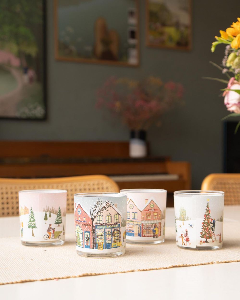 De glazen kaarsen van ViSSEVASSE zijn versierd met winterdorpjes en gevuld met kerstsfeer. Gebruik ze voor een rustmoment, als adventskaarsen of op de kersttafel.