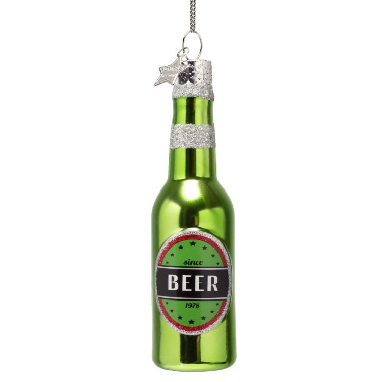 Proost op de feestdagen! Dit sprankelende bierflesje van gerecycleerd glas is mondgeblazen, met de hand beschilderd en perfect voor elke bierliefhebber.