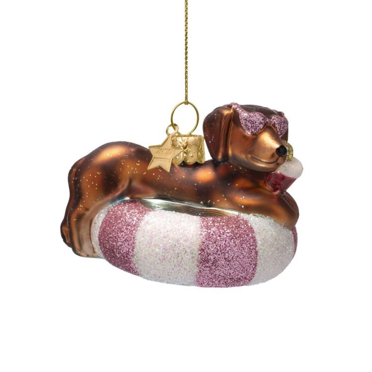 Vondels Teckel in zwemband H6cm kerstbal glas |