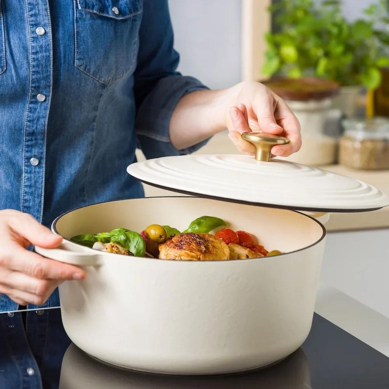 Het gietijzeren deksel sluit perfect aan, zodat smaken en vocht behouden blijven tijdens het garen. De stevige grepen en het tijdloze ontwerp maken deze pan niet alleen praktisch in gebruik, maar ook mooi genoeg om direct op tafel te zetten.