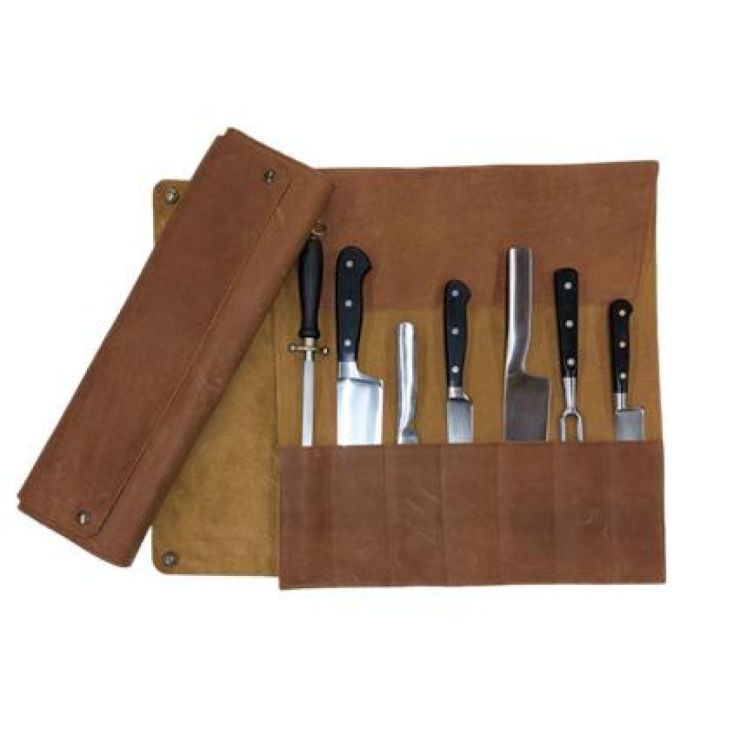 Deze messenrol in buffelleer is een praktische en stijlvolle manier om je messen veilig te bewaren en mee te nemen. Je rolt hem eenvoudig op, waardoor je messen goed beschermd blijven.