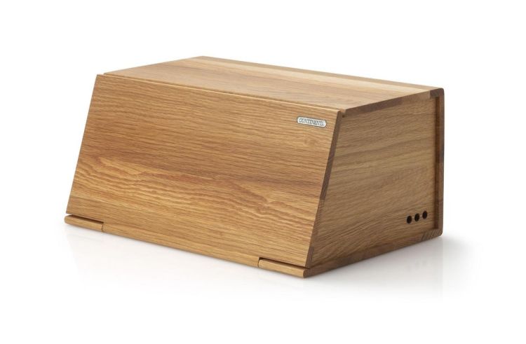 Een royale broodtrommel van massief eikenhout, zorgvuldig afgewerkt en behandeld met natuurlijke oliën voor een zijdeachtig oppervlak. Kleine ventilatieopeningen aan de zijkanten zorgen voor optimale luchtcirculatie, waardoor brood en gebak langer vers blijven.