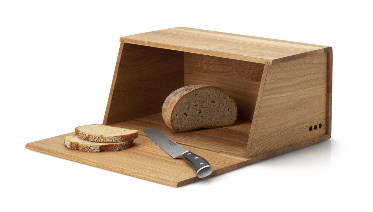 De klep kan bovendien dienstdoen als broodsnijplank. Dankzij de geïntegreerde greep is openen eenvoudig en ergonomisch. Ondanks zijn formaat neemt de trommel weinig ruimte in en kan de bovenkant als extra aflegruimte worden gebruikt.
