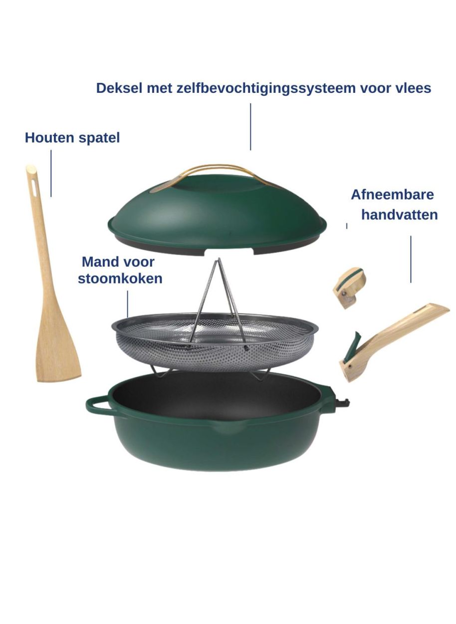 De pan die alles kan. Met La Fabuleuse breng je eenvoud én plezier terug in de keuken. Deze slimme alleskunner vervangt maar liefst 8 verschillende kookgerei: koekenpan, kookpot, braadslede, ovenschotel, stoompan, frituurpan, bakvorm én pizzasteen. Eén pan, eindeloos veel mogelijkheden.