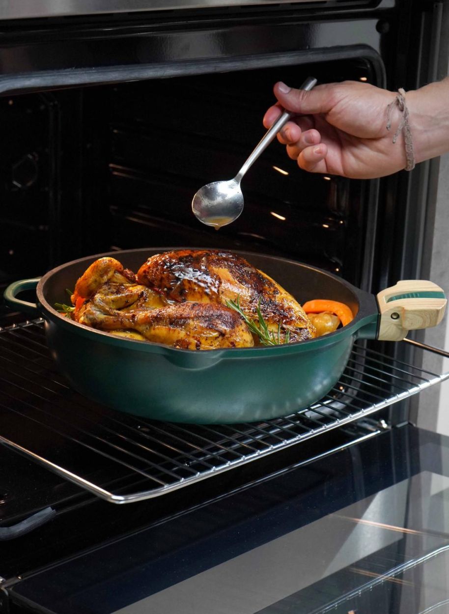 Het slimme deksel heeft een geïntegreerd zelfroosterend systeem: tijdens het garen vallen de druppeltjes terug over je vlees of stoof, waardoor alles heerlijk mals en sappig blijft. En met het koelblijvende handvat op het deksel pak je het veilig vast, zelfs middenin de kookpret.