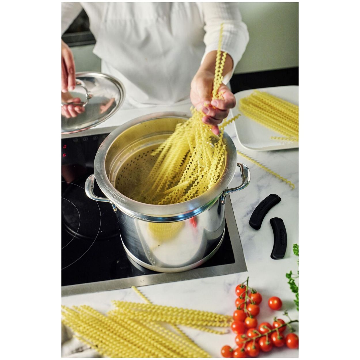 Ervaar hoe eenvoudig en efficiënt koken kan zijn met de Demeyere Specialties 5 Universele Pasta-inzet. Bereid een romige tagliatelle met zalm en dille of een frisse salade van geblancheerde groene asperges en sugarsnaps. Dankzij deze universele inzet wordt het koken van pasta of blancheren van groenten niet alleen gemakkelijker, maar ook veiliger en duurzamer. Het hergebruiken van het kookvocht als basis voor een rijke bouillon of een smaakvolle soep geeft je gerechten extra diepte en bespaart tijd en energie. Ideaal voor zowel snelle doordeweekse maaltijden als uitgebreide weekenddiners.