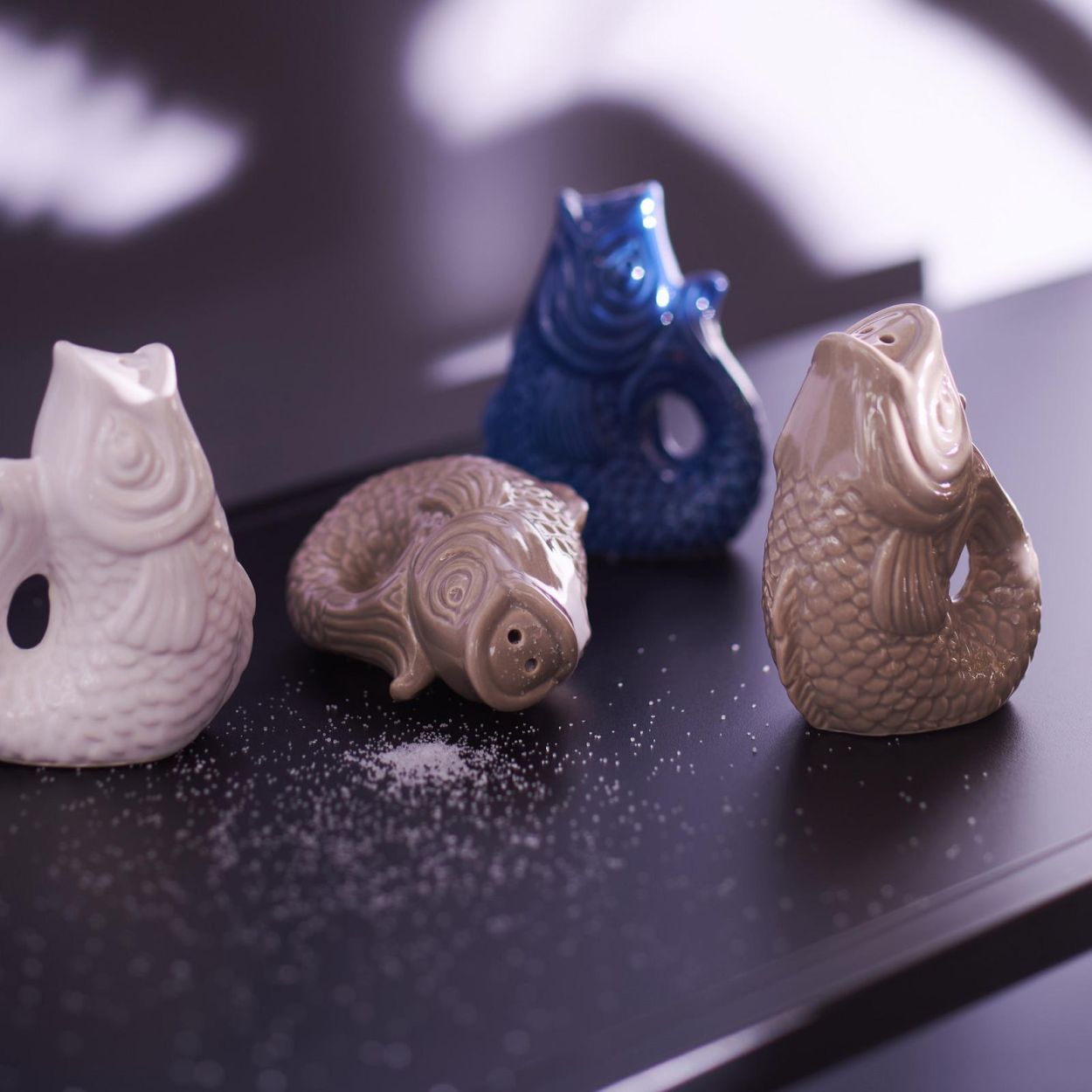 Leuke set in visvorm, voor zout en peper. Praktisch én grappig op tafel.