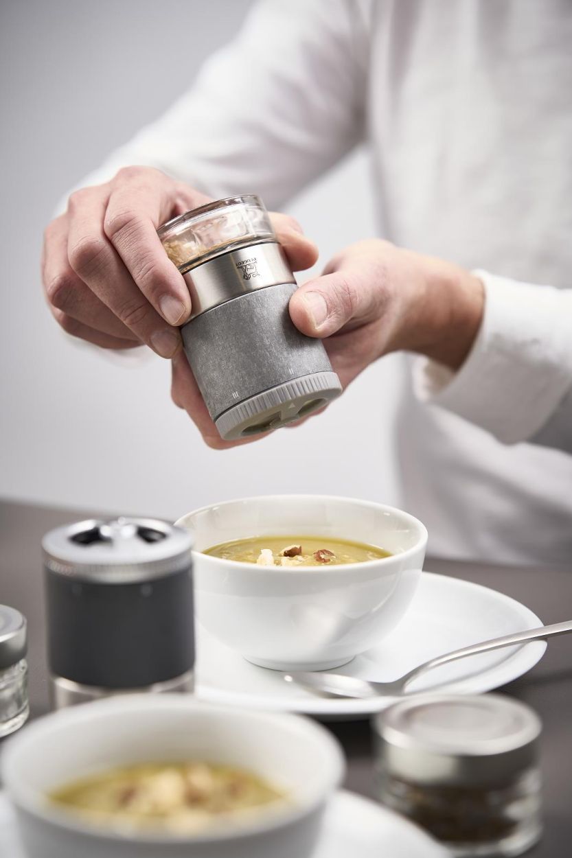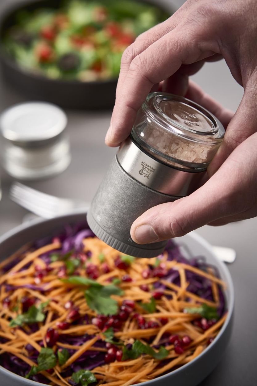 De Maestro Zoutbar is geen gewone molen, maar een compleet systeem. Dankzij het slimme design wissel je met één draai van zoutsoort: de glazen reservoirs zijn verwisselbaar, en klikken moeiteloos op de molen. Zin in fijn wit steenzout? Of liever iets grover, kruidiger? Je schakelt in seconden.