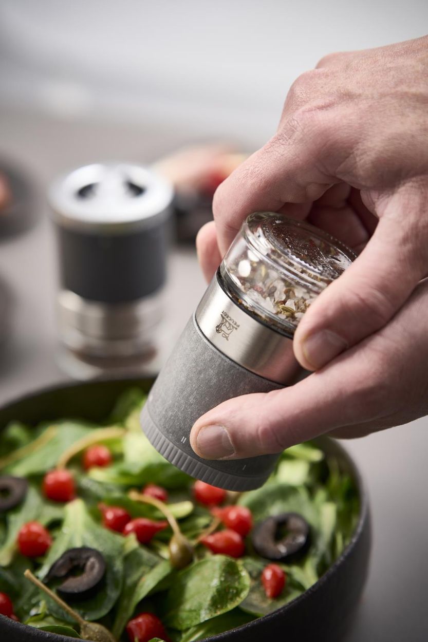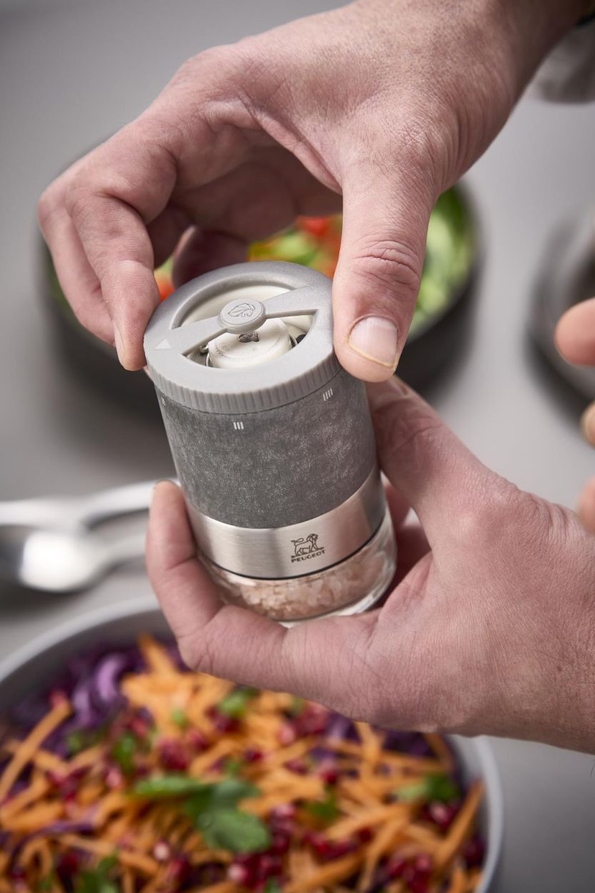 Binnenin zit het Zirlion-mechanisme van Peugeot – gemaakt van extreem hard keramiek, slijtvast en roestvrij. Samen met het u'Select-systeem kies je exact de maalgraad die je wil: van ijzig fijn tot krokant grof (tot 6 mm zout). Niet geschikt voor vochtig zout.