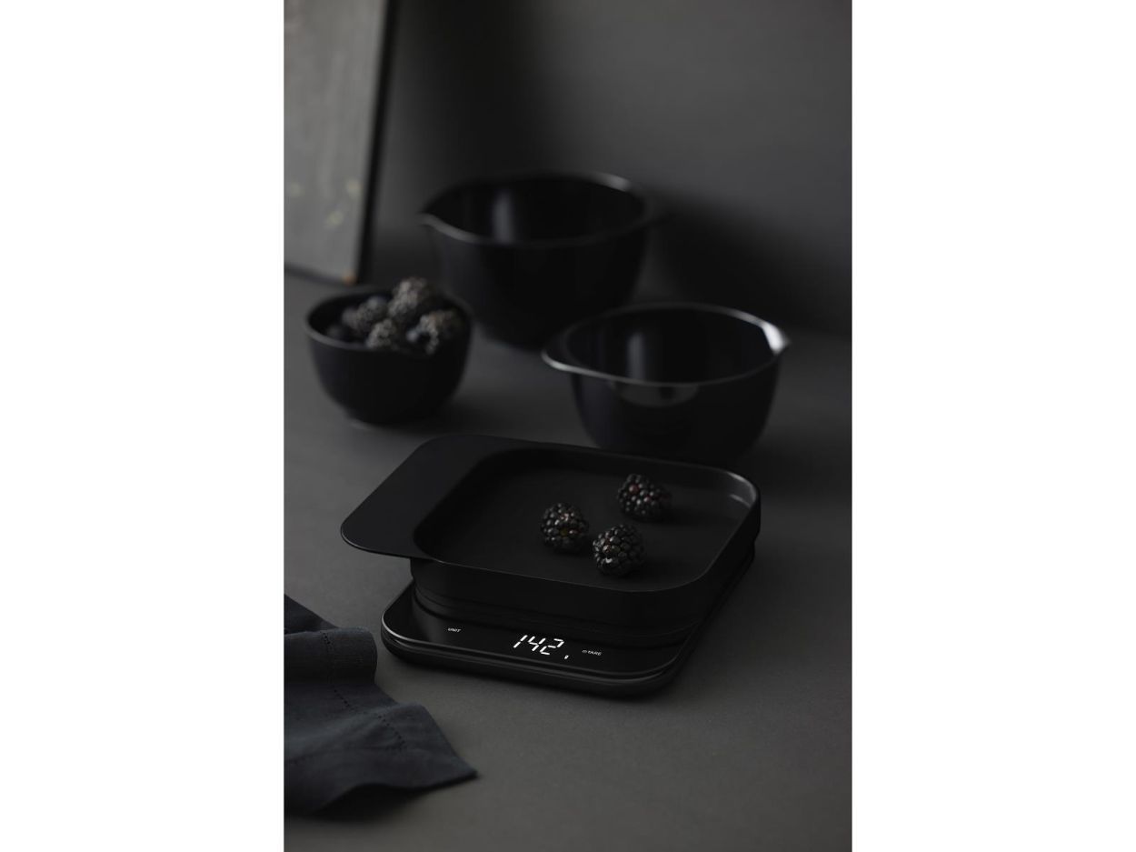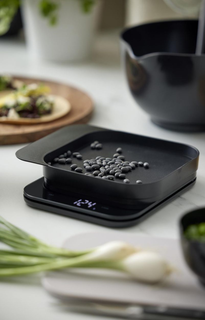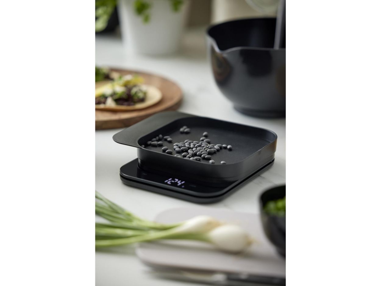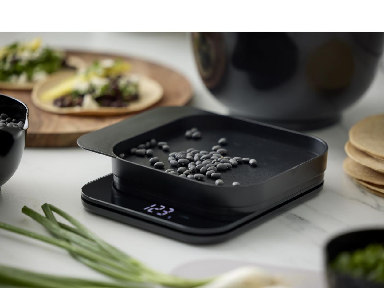 Het is mogelijk om te schakelen tussen verschillende meeteenheden: g, kg, oz, lb, ml, fl oz, en het gewicht heeft een tarrafunctie. Gaat handmatig aan en gaat automatisch uit. Onder de basis zijn vier L-vormige siliconen voetjes in dezelfde kleur als de schaalverdeling geplaatst.