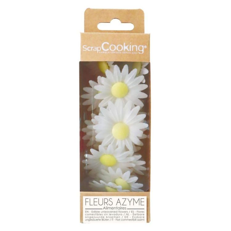Geef je baksels een elegante en natuurlijke look met deze 18 witte margrieten van azyme (ouwelpapier). Licht, eetbaar en supermakkelijk te gebruiken – gewoon op je taart leggen en klaar!