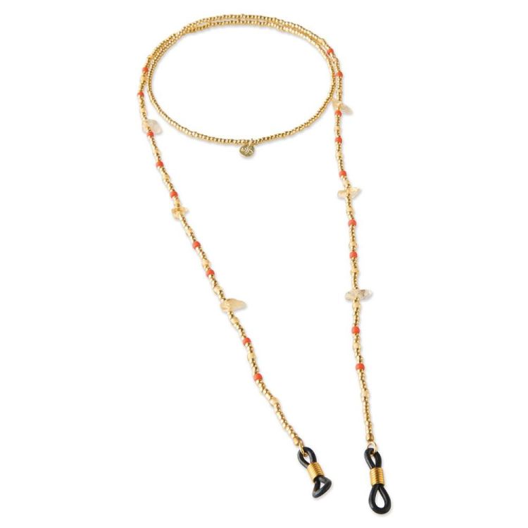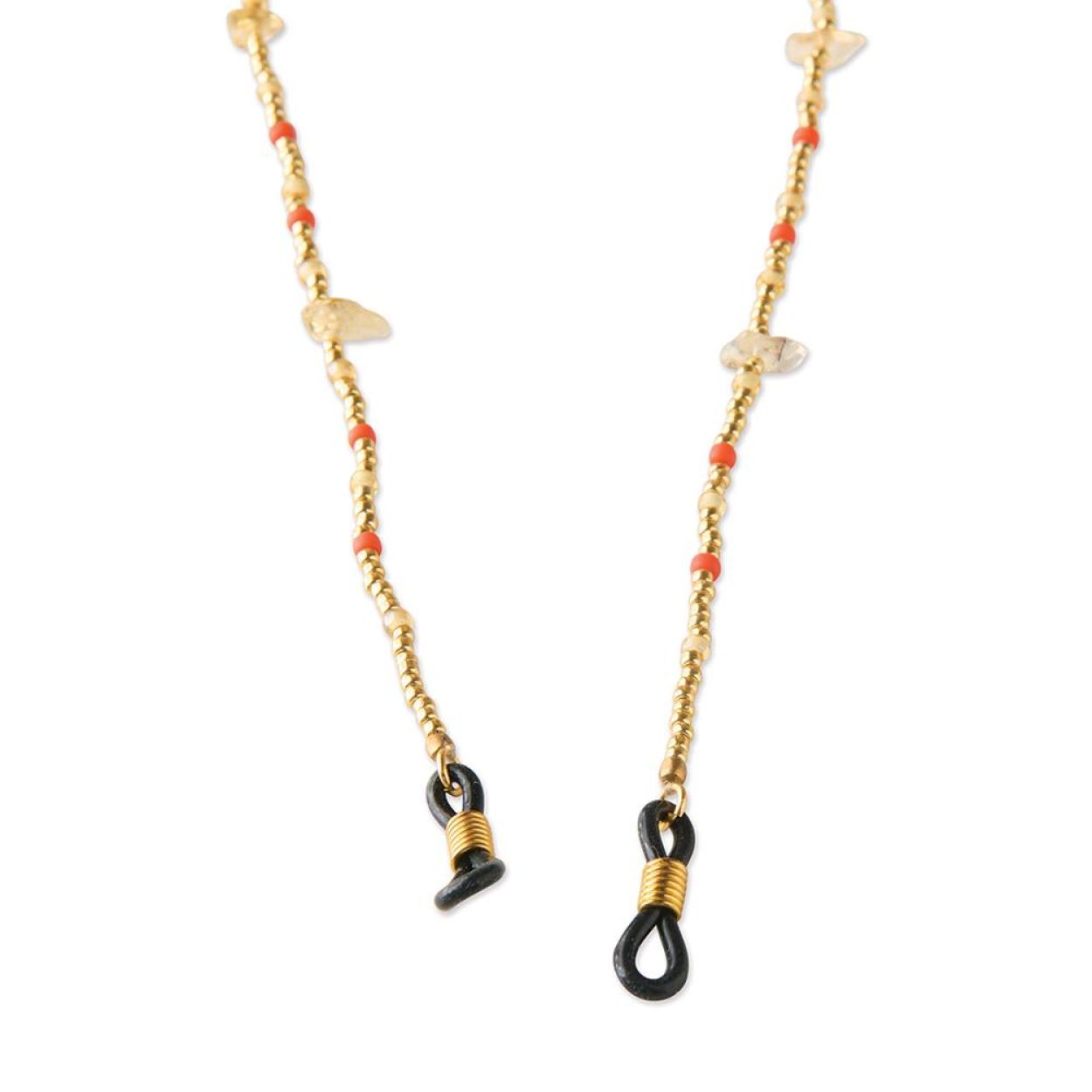 Het Enlighten Citrien Goudkleurige Brillenkoord is handgemaakt met ruwe citrien edelstenen en glaskralen in oranje, geel en goudkleur. Het koord heeft een lengte van 74 centimeter en de rubberen uiteinden zorgen ervoor dat je bril stevig blijft zitten.De energie van citrien is net een warme zomerdag: zo’n dag die niet meer stuk kan, zo’n dag waarop alles licht is. Met deze steen in de buurt heb je de zon altijd bij je.