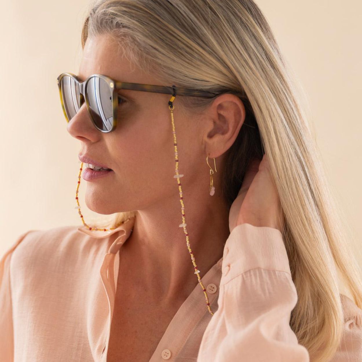 Het Enlighten Rozenkwarts Goudkleurige Brillenkoord is handgemaakt met ruwe rozenkwarts edelstenen en glaskralen in roze en goudkleur. Het koord heeft een lengte van 74 centimeter en de rubberen uiteinden zorgen ervoor dat je bril stevig blijft zitten. Rozenkwarts is de steen van de liefde. Zijn er problemen? Rozenkwarts lost ze op met zachtheid en compassie. Voor iedereen om je heen, maar vooral voor jezelf. Want echte liefde begint in je eigen hart.