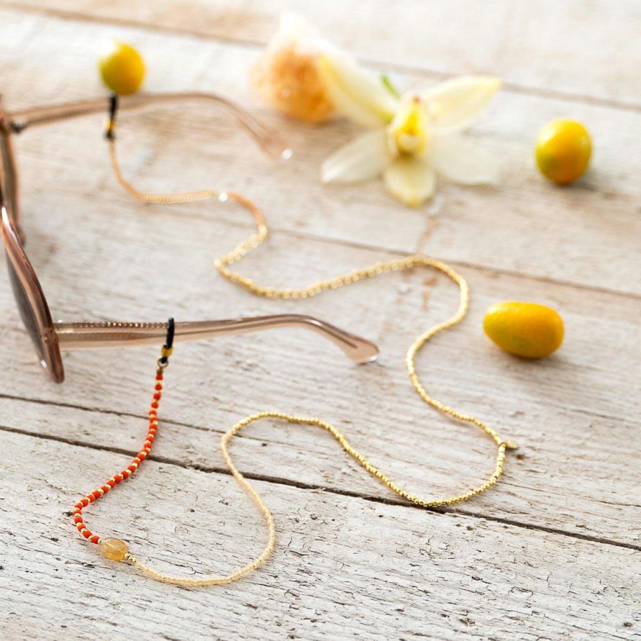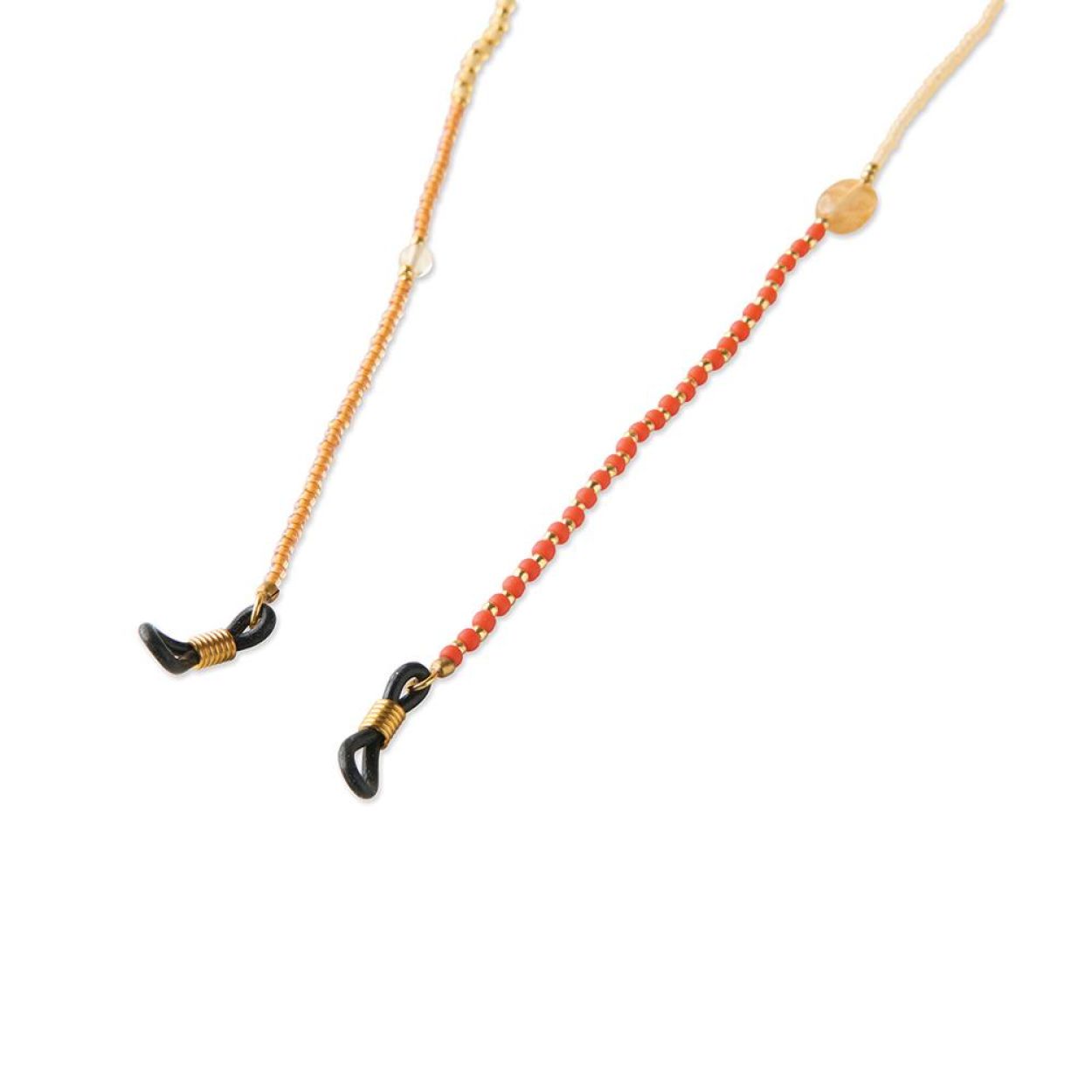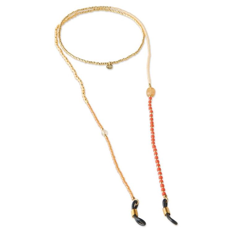 Het Unified Citrien Goudkleurige Brillenkoord is handgemaakt met 2 citrien edelstenen en glaskralen in oranje, geel en goudkleur. Met een lengte van 74 centimeter en rubberen uiteinden blijft je bril stevig op zijn plek. Citrien vult elk moment met geluk en plezier.