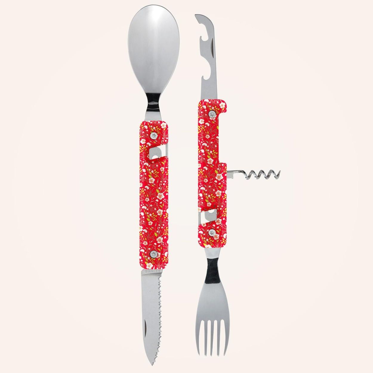 Bestek in roestvrij staal 2CR14 met gepolijste spiegelafwerking. Deze handige multitoolset bestaat uit een grote lepel, een 4-tandige vork , een mes met een microgekarteld lemmet en een flesopener, dit alles heel handig op te bergen dankzij het inklapbaar systeem! De multitool is versierd met een transparant polymeer handvat. Dankzij het het magnetische binnenwerk klikt het bestek samen na gebruik.
