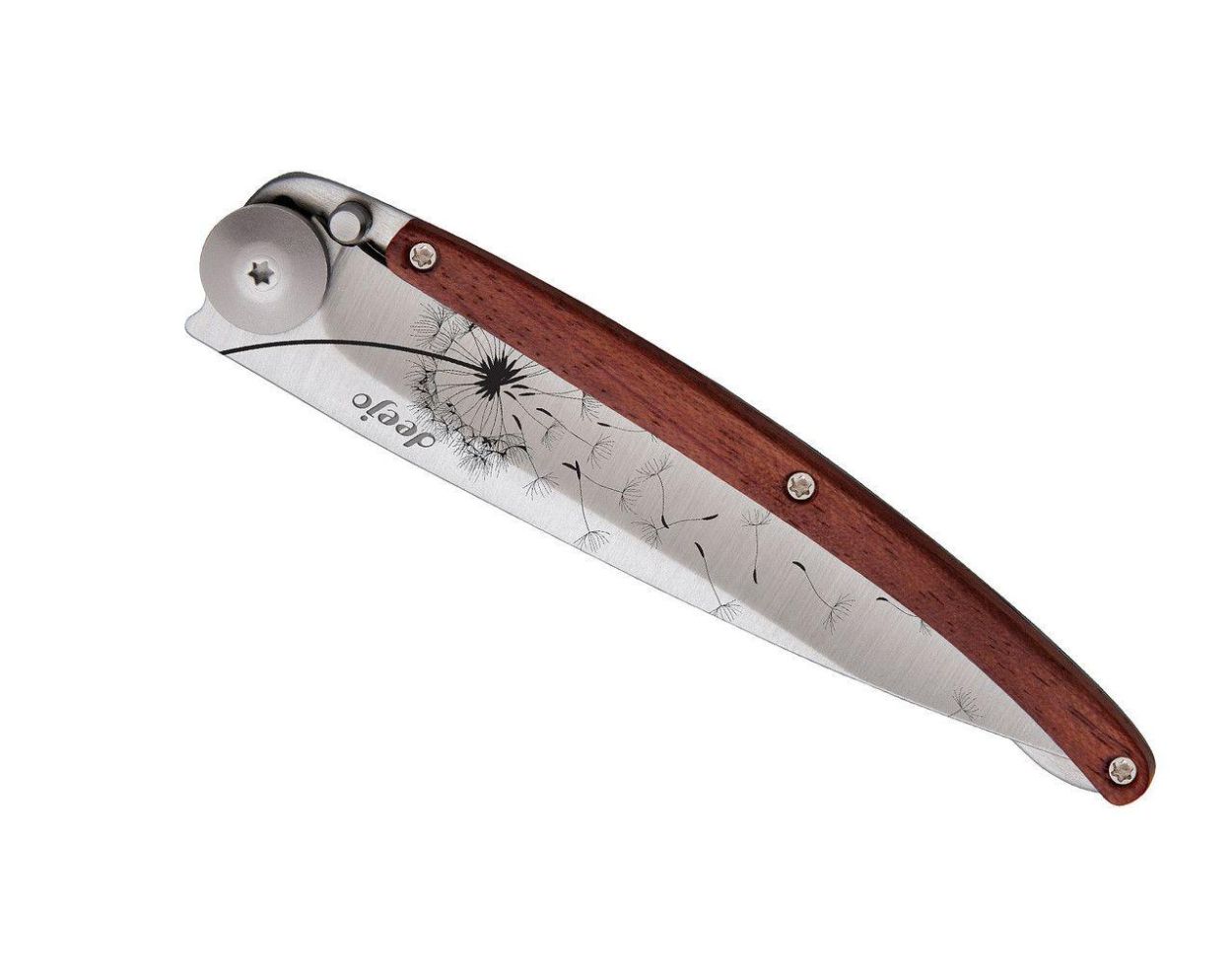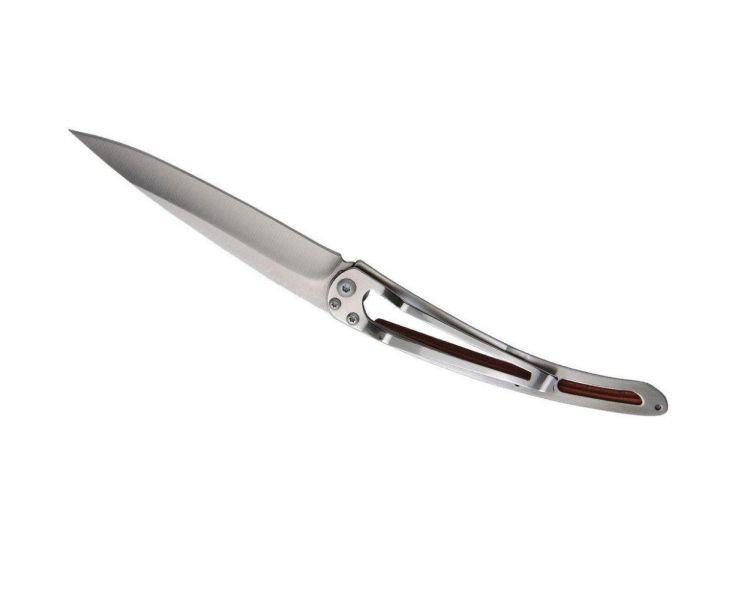 Dit Deejo-mes is versierd met een greepplaat van massief koraalhout (of padauk). Deze houtsoort wordt al lang in bestek gebruikt vanwege de prachtige rood/amberkleurige reflecties (vandaar de naam), de robuustheid en de uitstekende vochtbestendigheid. Hier onderstreept het op prachtige wijze de elegantie van een Deejo mes.