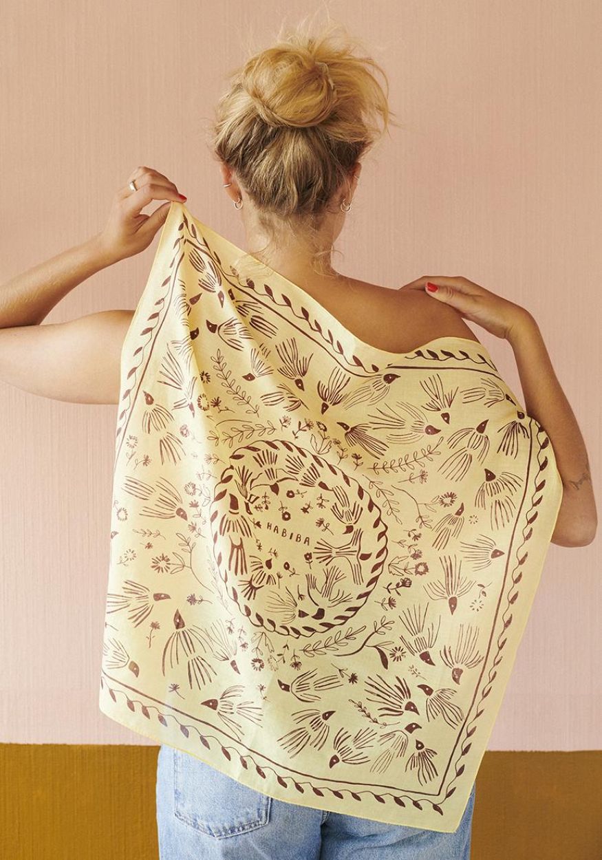 De Pattie Bandana heeft een zachte, bijna poëtische uitstraling. De handgetekende print met kleine vogeltjes en fijne bloemetjes voelt licht, speels en een beetje dromerig — alsof er een klein stukje natuur in het ontwerp verstopt zit. Een lieve en persoonlijke bandana, met zorg en liefde gemaakt door HABIBA.