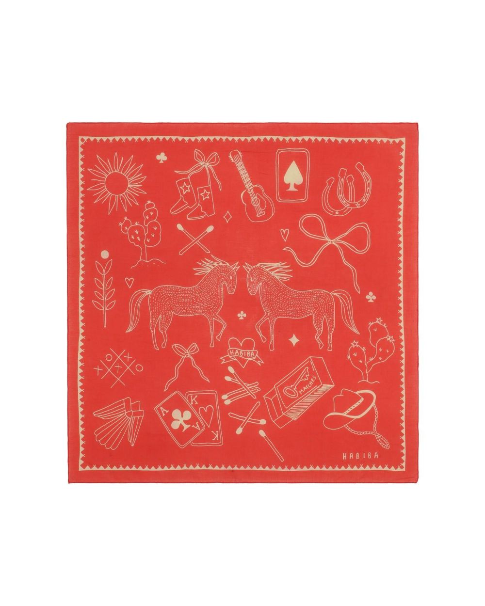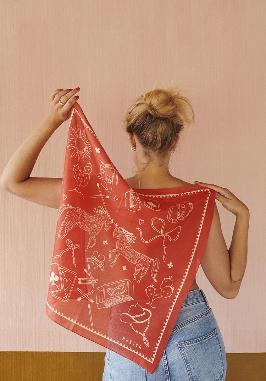 De Polly Solo Bandana is een klein avontuur in stof. Geïnspireerd door de sfeer van het Wilde Westen vertelt deze handgetekende bandana een verzameling speelse, eigenzinnige verhaaltjes. Tussen de fijne illustraties ontdek je telkens nieuwe details. De bijzondere rand en het handgetekende HABIBA-logo maken het ontwerp extra persoonlijk — alsof elk stukje met de hand is bedacht.