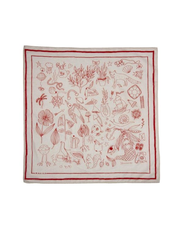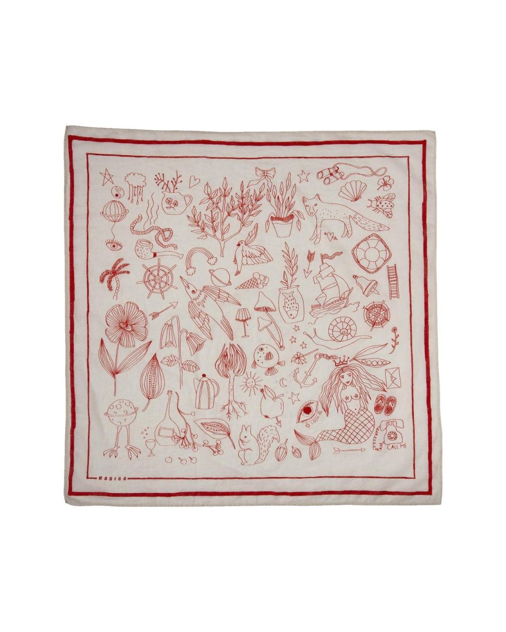 Een klein kunstwerk dat je overal mee naartoe neemt. De Vanessa Bandana is versierd met een speelse handgetekende position print vol verrassende, kleine details die het ontwerp karakter en charme geven. De handgetekende rand en het subtiele HABIBA-logo maken het geheel extra persoonlijk — alsof er een klein stukje creativiteit speciaal voor jou is gemaakt.