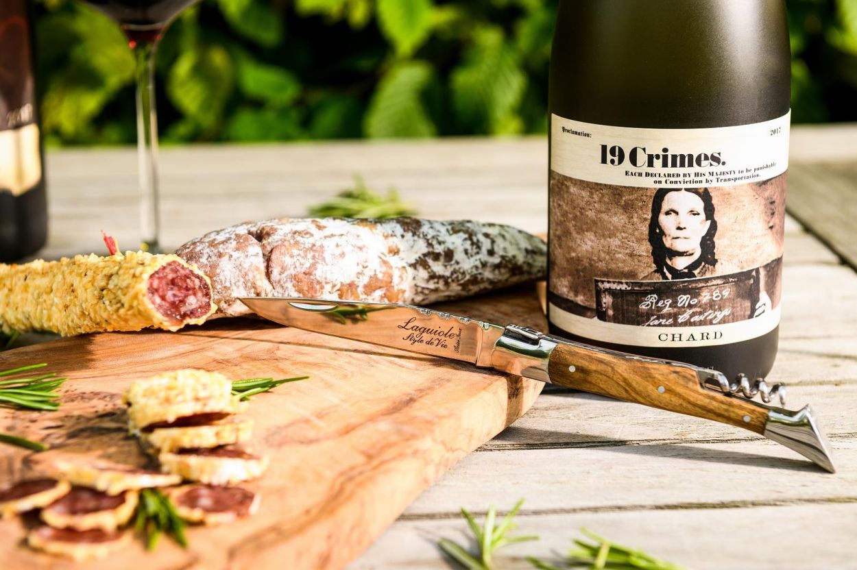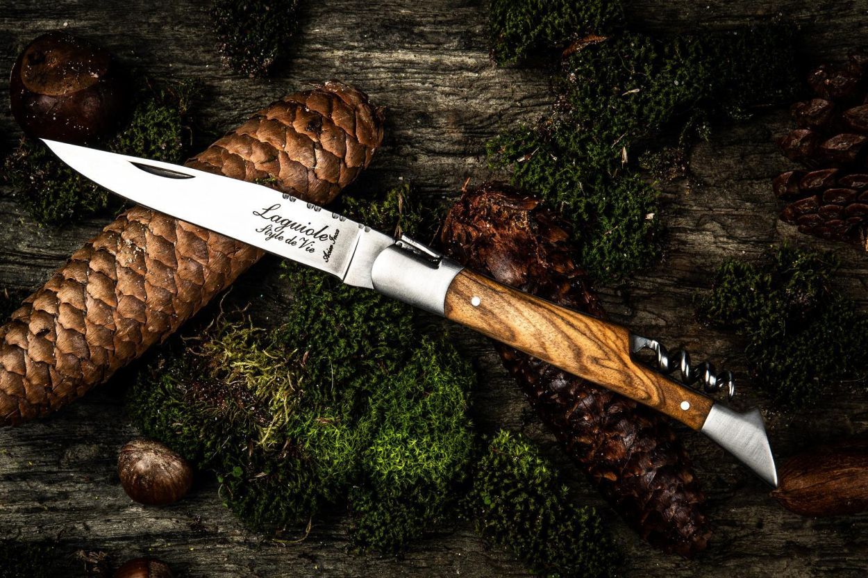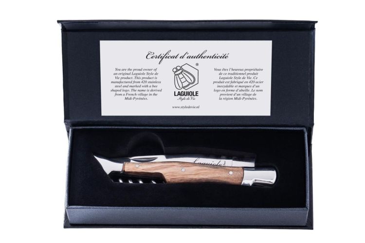 Zakmes en kurkentrekker in één, met een glad roestvrijstalen lemmet van 2,5 mm dik en het authentieke Laguiole-bijtje. Afgewerkt met een olijfhouten handvat en geleverd in een luxe geschenkverpakking. Niet vaatwasmachinebestendig.
