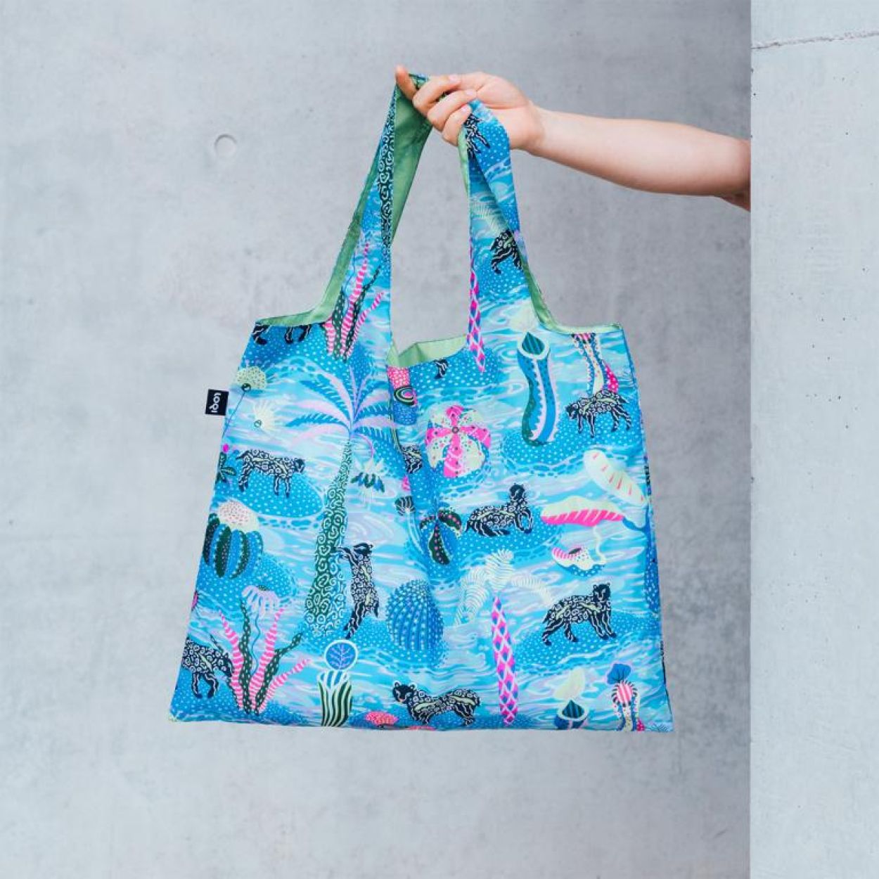 De Quandary Quagmire tas van LOQI, ontworpen door Sam Wilde, toont een surrealistische onderwaterwereld waar luipaarden loungen tussen neonkoralen, cactussen met patronen en fantasierijk zeewier. Op een glinsterende turquoise achtergrond komen elektrisch roze, pittig groen en zonnig geel samen in een levendige mix. Een opvallend ontwerp dat aanvoelt als een popart-dagdroom.