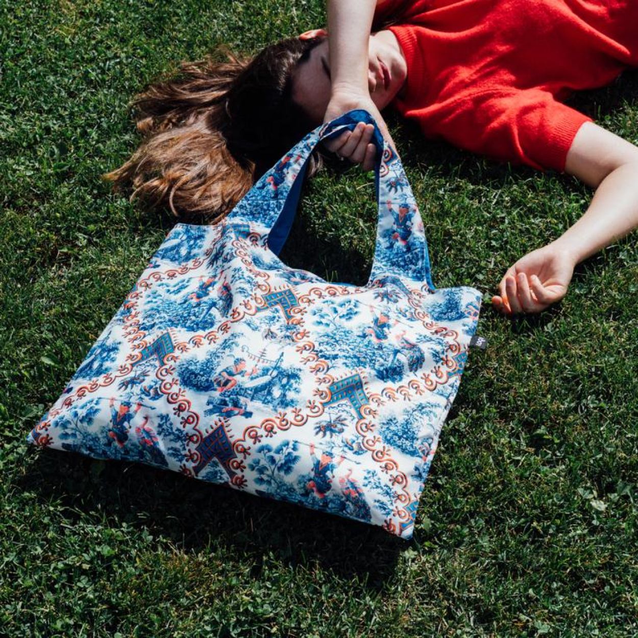 De Toile de Jouy Juggler tas van LOQI toont een speelse jongleerscène, omlijst door klassieke blauwe landschappen. Vrolijke rode papegaaien voegen een onverwachte, eigenzinnige toets toe aan de vintage geïnspireerde print. Een charmante combinatie van traditionele vertelkunst en moderne speelsheid.
