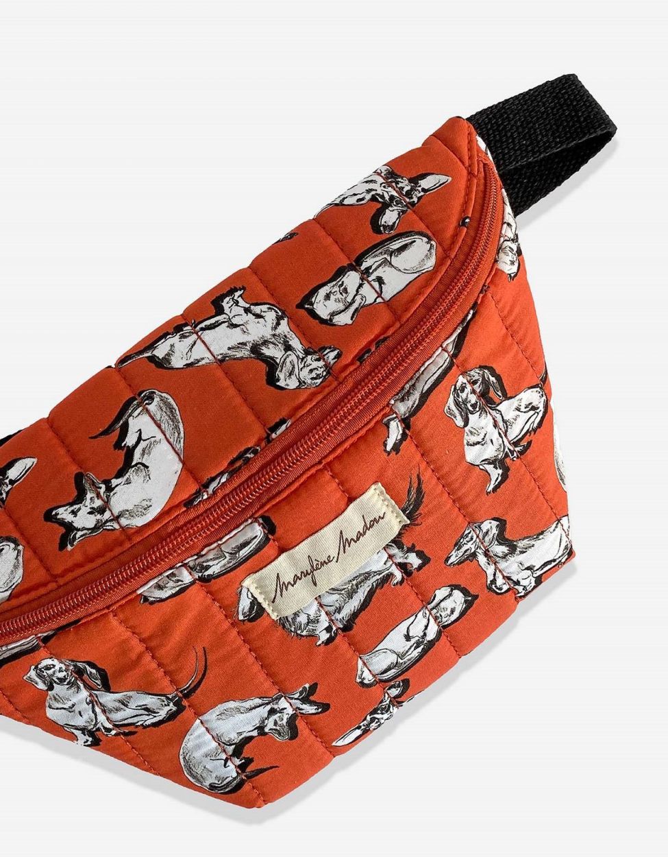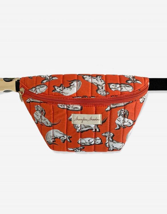 Een klassiek heuptasje in doorgestikt katoen, uitgevoerd in onze speelse Wiggle Doxies print — een van Marylène’s iconische handgetekende dessins. De print brengt beweging en humor, typisch voor haar wereld van verfijnde eigenzinnigheid. Compact, maar praktisch: er past een gewone portefeuille en wat essentials in. Binnenin zit een extra ritsvak om alles netjes te houden. De katoenen band is verstelbaar en draagbaar rond de heup of gekruist over het lichaam. Licht, functioneel en vol karakter — zoals elk stuk uit het atelier van Marylène Madou.