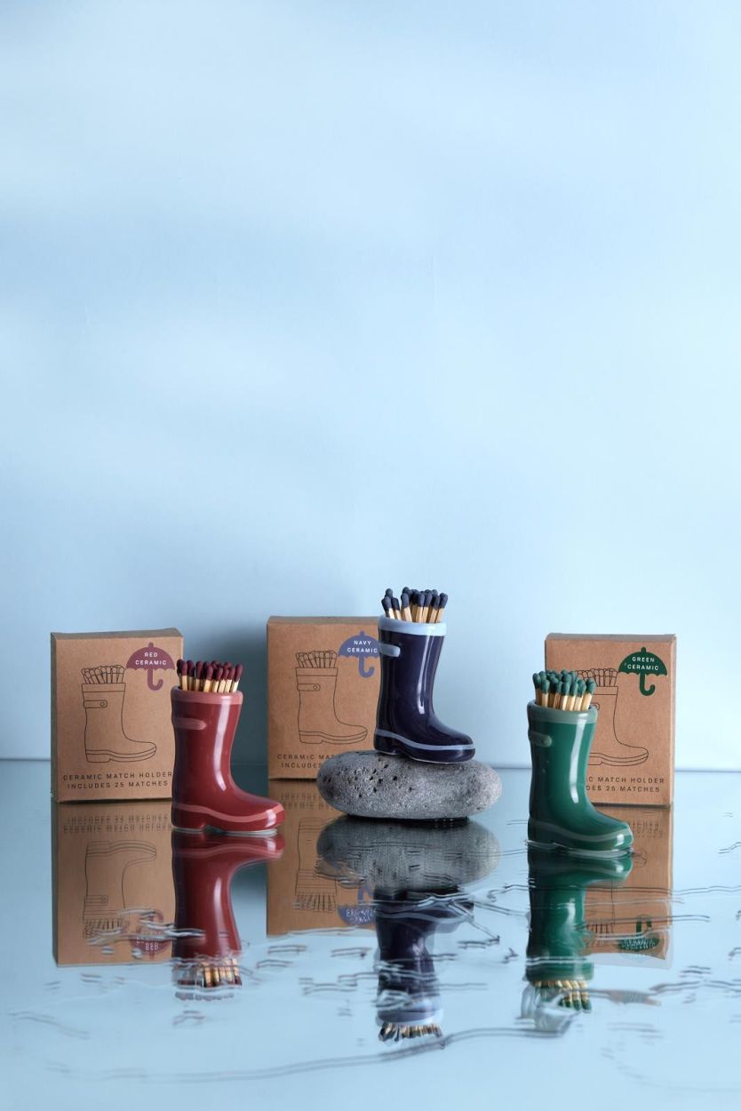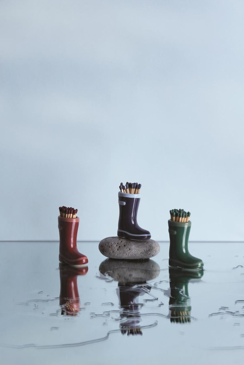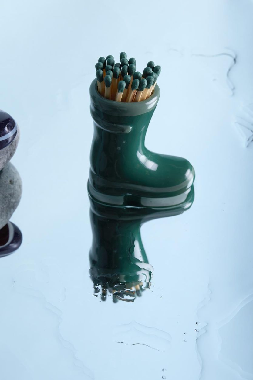 Deze keramieken regenlaars is gemaakt om te vonken, niet om te spetteren. De handbeschilderde houder bevat 25 veiligheidslucifers die je eenvoudig aan de onderzijde van de laars aansteekt. Een speels woonaccessoire dat net zo goed cadeau kan worden gedaan als op tafel of haardmantel kan pronken.