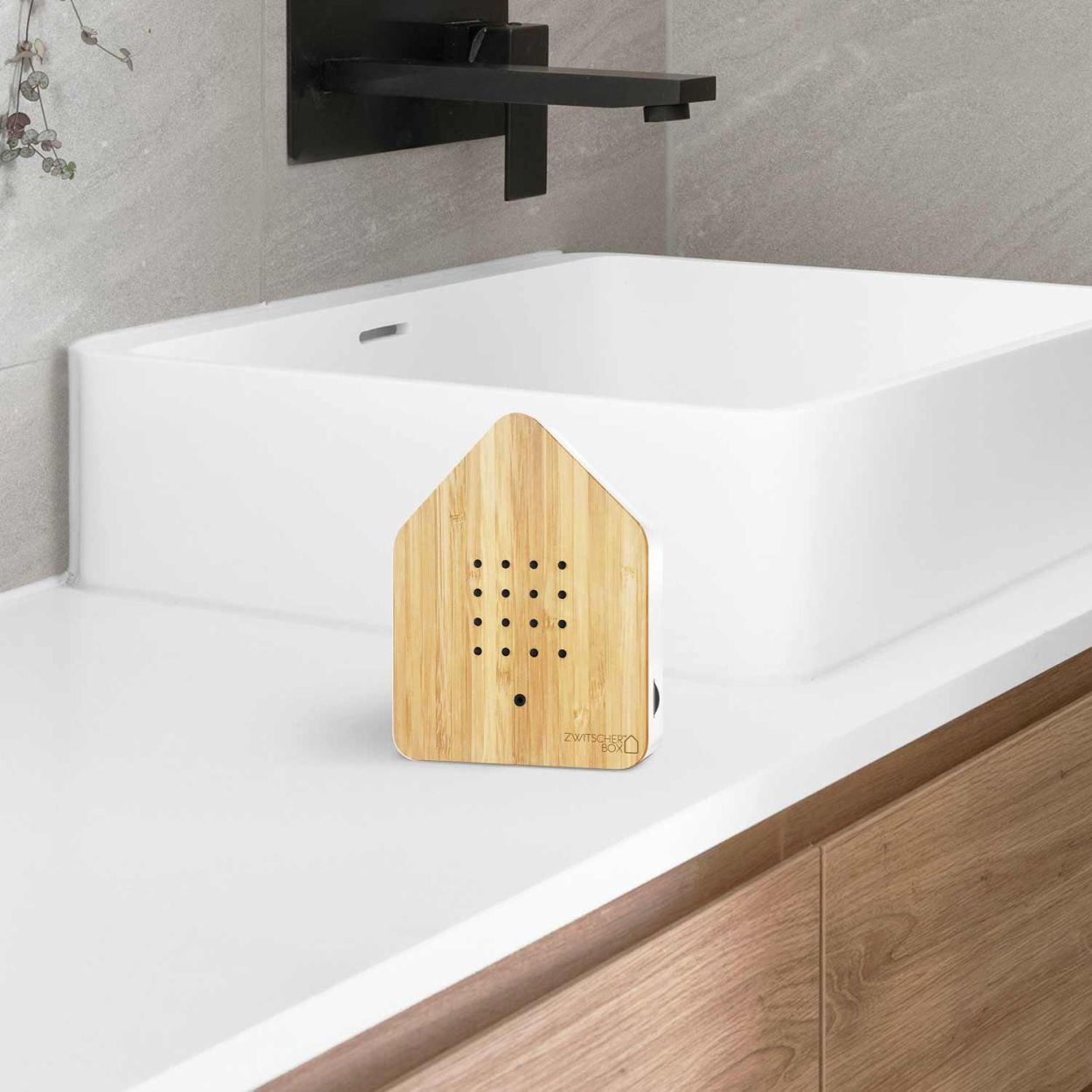 Breng rust en natuur in huis met de Zwitscherbox Bamboo – een stijlvolle geluidsbox die je zintuigen meeneemt naar een zonnige bosweide. De front van echt bamboe zorgt niet alleen voor een elegante, natuurlijke uitstraling, maar is ook milieuvriendelijk: bamboe is een van de snelst hernieuwbare grondstoffen ter wereld.