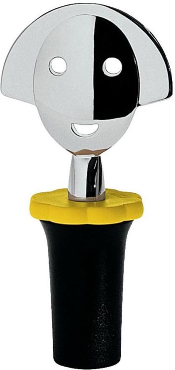 Een speels designobject dat functionaliteit en karakter combineert. Anna Stop 2 is uitgevoerd in zwart thermoplastisch hars met chroom-geplateerd zamak en gele accenten. Met een hoogte van 10 cm en een diameter van 4 cm sluit zij flessen stijlvol en luchtdicht af.
