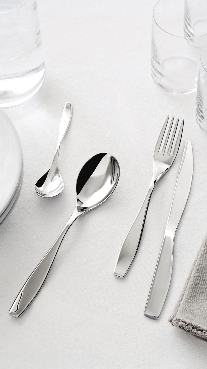 De set wordt gekenmerkt door minimalistische lijnen en subtiel taps toelopende handvatten. Het smalle, verfijnde uiteinde – een soort “taille” die doet denken aan de vrouwelijke silhouetten van de jaren ’50 – vormt het onderscheidende detail van de collectie.