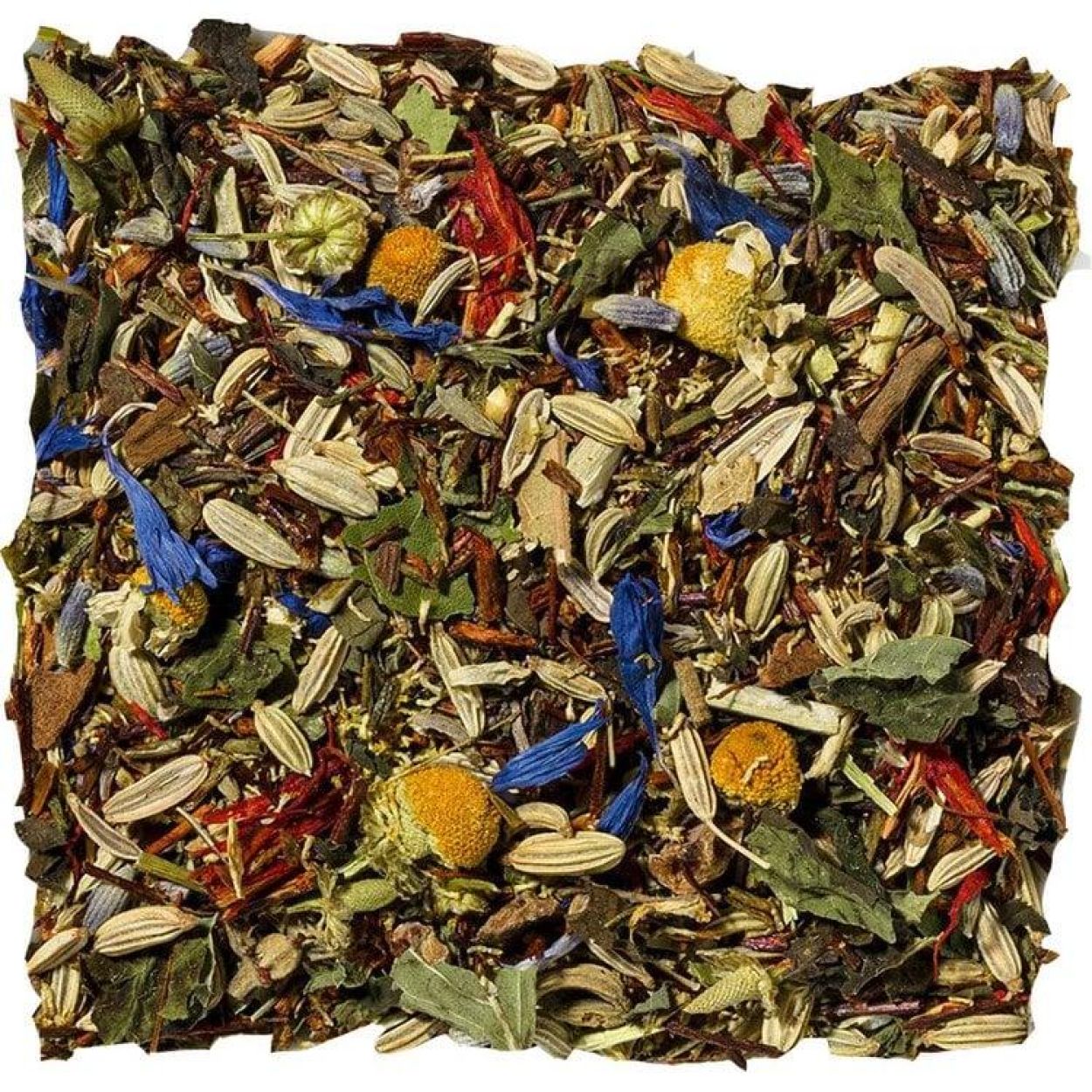 Zoete venkel, rooibos, groene rooibos, kamillebloesem, johannesbrood, citroenmelisse, kaneel, lindebloesem, lavendelbloesem, valeriaanwortel, ashwagandha-extract (1%), passiebloemkruid, natuurlijk aroma, saffloerbloemblaadjes, korenbloem bloemblaadjes.