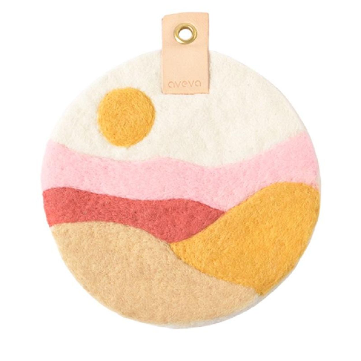 Ideaal om pannen op te zetten, want wol is van nature vuil- en hittebestendig. De handgemaakte onderzetters van Aveva beschermen, versieren en geven kleur aan je tafel. Deze onderzetter is gemaakt van hoogwaardige wol, met AZO-vrije kleuren en een natuurlijke weerstand tegen hitte en vlekken. Dankzij het handige ophanglusje kan hij zowel aan de muur hangen als op tafel gebruikt worden.