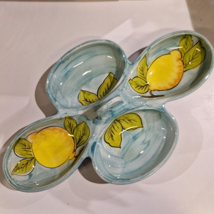 Deze toffe antipasti schaal, gemaakt in Italië, brengt meteen zon en sfeer aan tafel. Met vier handige vakken is ‘ie perfect om al je hapjes stijlvol te serveren. En die vrolijke, handgeschilderde citroenen? Pure eyecatcher met een frisse blauwe touch!