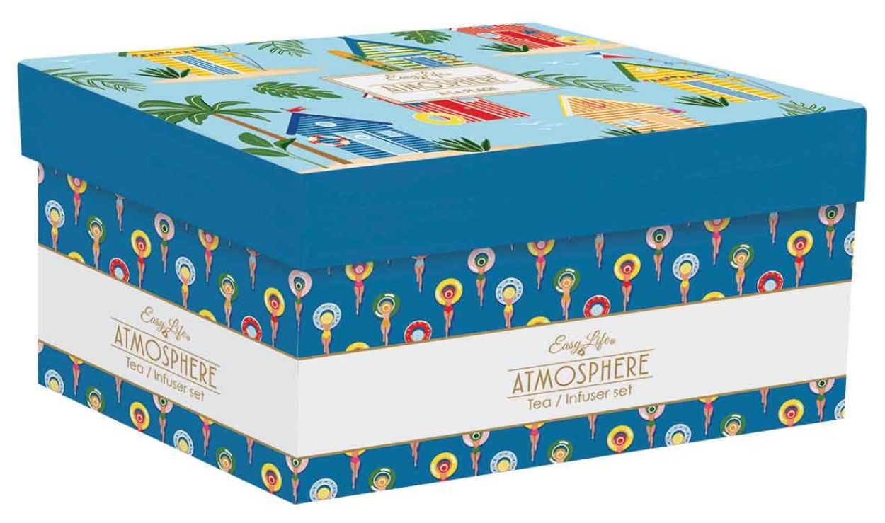 Porseleinen theepot (600 ml) met inox filter en twee bijpassende tassen (160 ml), allemaal met zomerse prints. Ideaal voor een ontspannen theemoment met z’n tweeën. Verpakt in een mooie cadeaudoos.