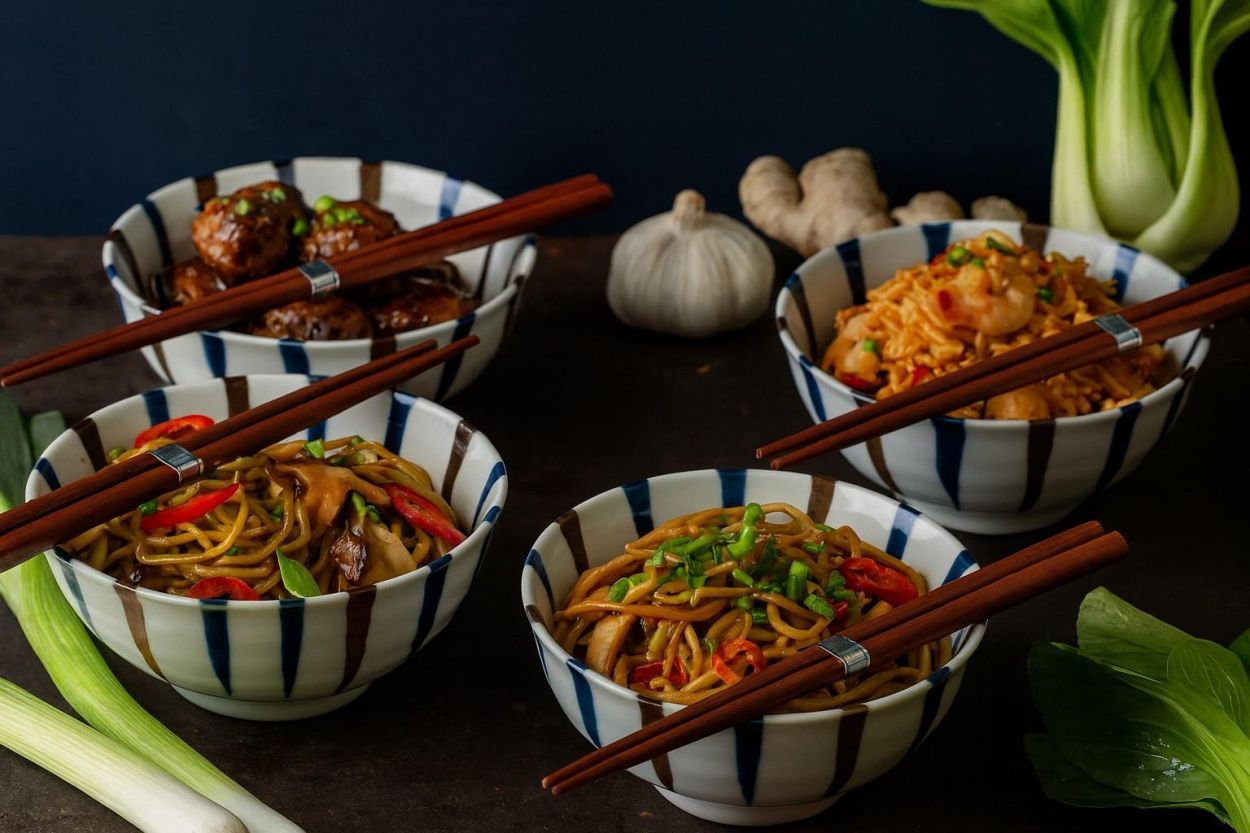 Met vier ronde kommetjes en vier paar houten eetstokjes biedt deze set alles voor een complete bowl-ervaring.