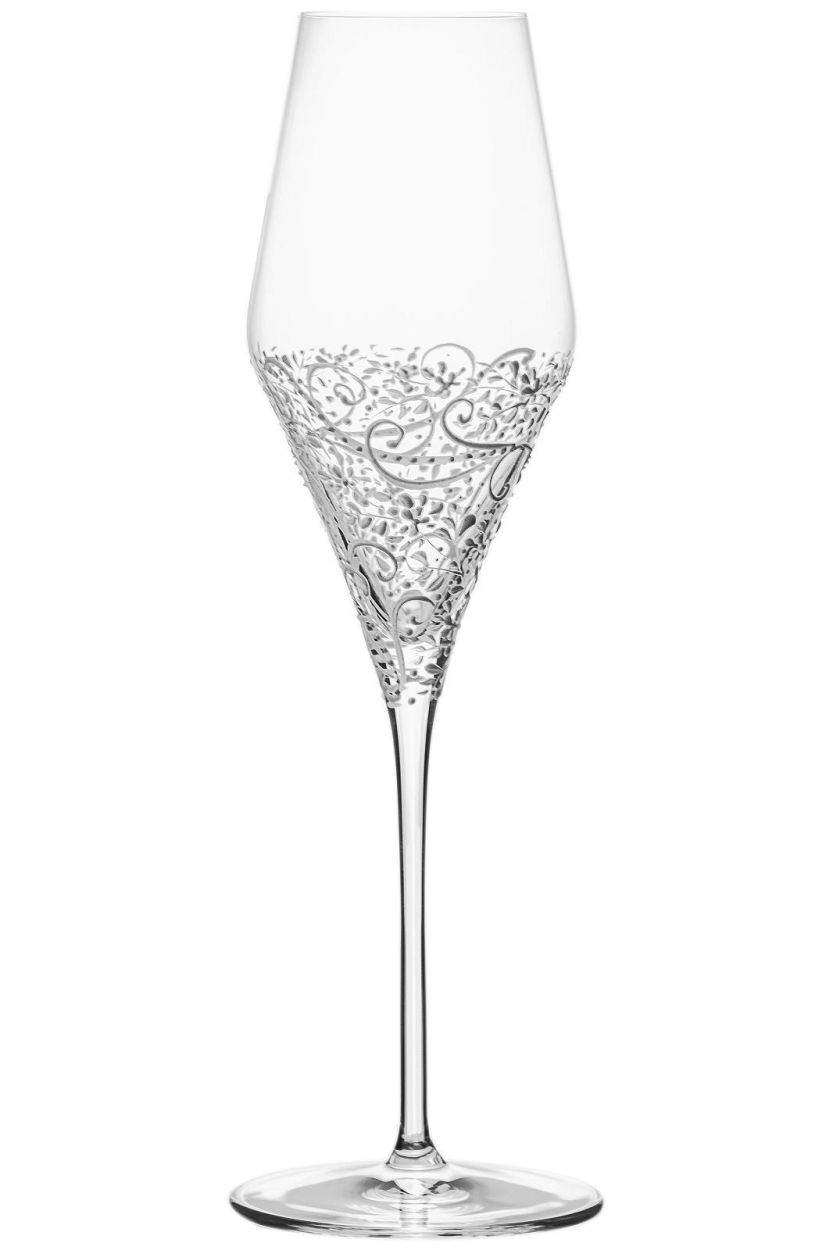Een glas dat het oog blijft vangen. Het Magic Champagneglas is vervaardigd uit helder, loodvrij Tsjechisch kristal en met de hand beschilderd met een verhoogd wit motief. De lijnen zijn vloeiend en licht gebold, als sierlijke bewegingen die zich in het glas hebben vastgezet.