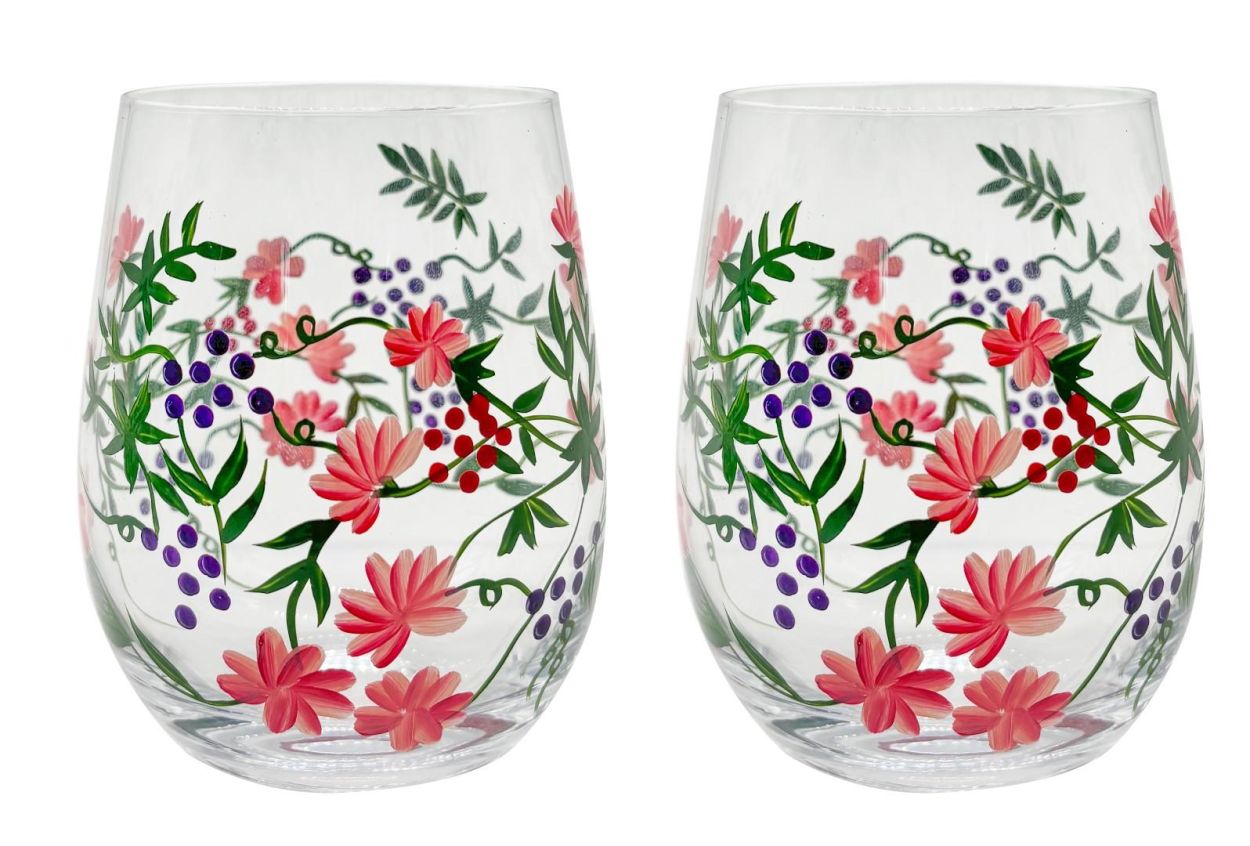 Deze limited edition set van twee Flora tumblers brengt kleur en elegantie op tafel. Elk glas is met de hand beschilderd met fijne bloemenmotieven, waardoor elk stuk een uniek, ambachtelijk karakter krijgt. Kleine variaties in kleur en patroon maken deel uit van deze charme.