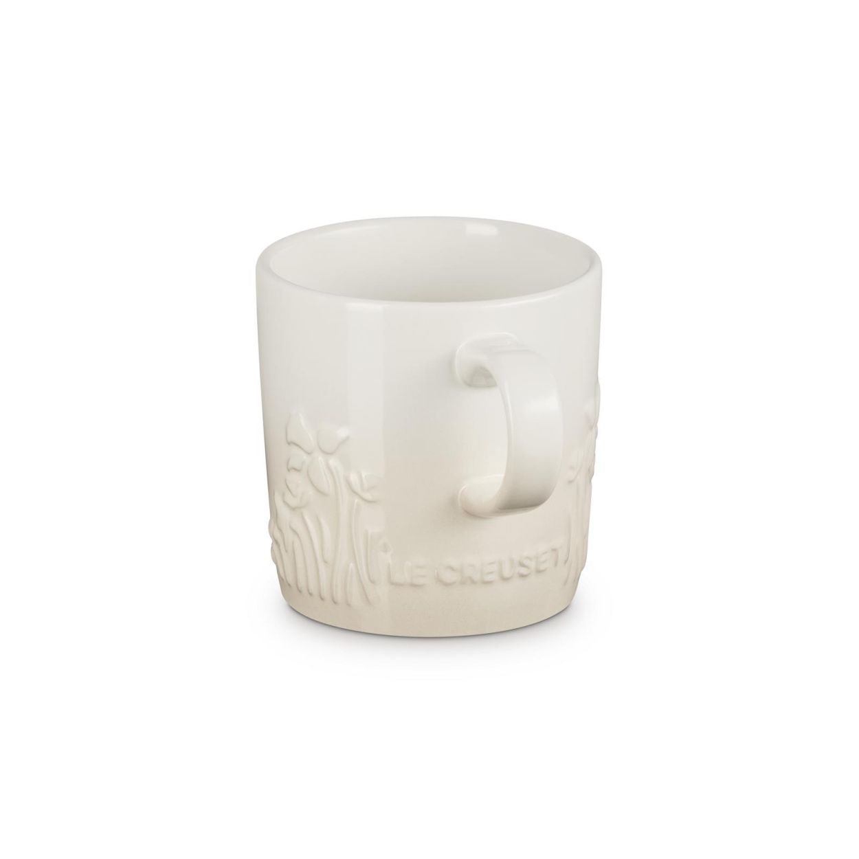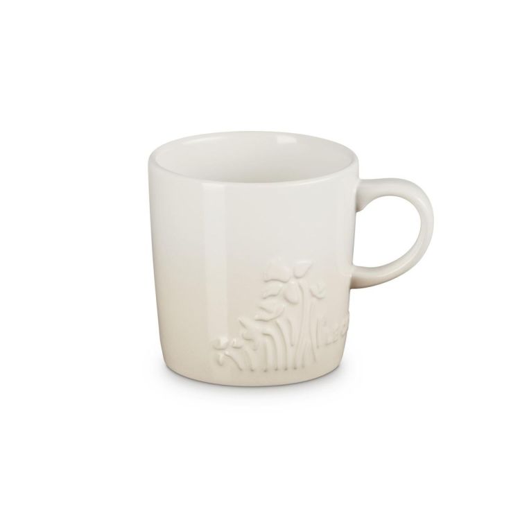 Een tijdloze mok met bloemendetail, fijn in de hand en ideaal voor koffie, thee of warme chocolade.