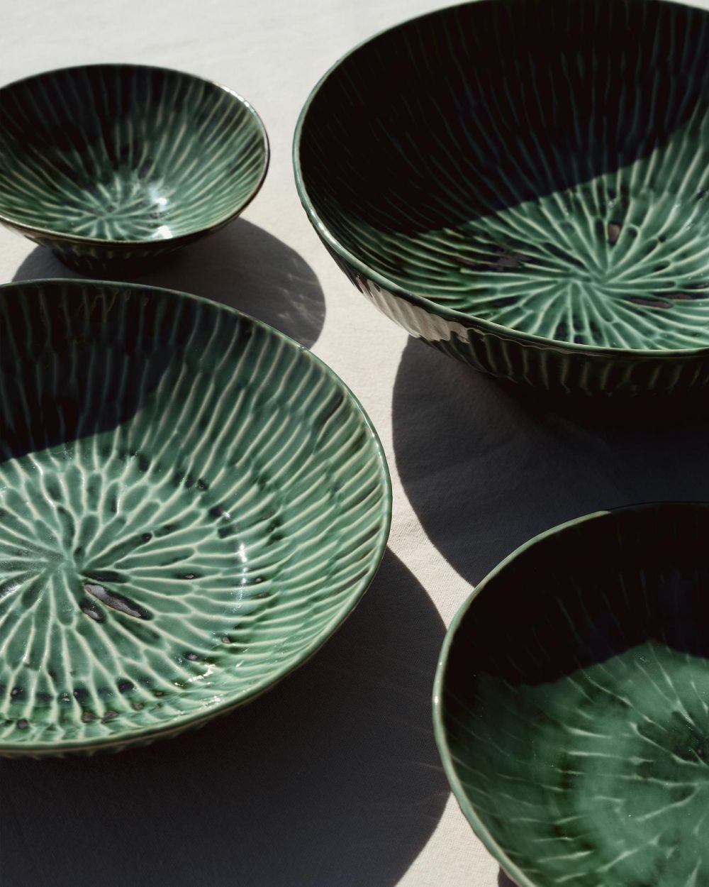 Voor haar nieuwste creatie dook Pascale Naessens niet alleen haar keramiekatelier in, maar ontwierp ze ook een eigen servieslijn: Verde Lanza, exclusief geproduceerd door Serax. De naam verwijst naar Lanzarote, het eiland waar Pascale vaak verblijft en inspiratie vindt. Het diepe, verweerde groen van de houten ramen, deuren en schaarse begroeiing steekt er krachtig af tegen het donkere vulkaanlandschap — precies die sfeer vertaalt zich in het servies. De kleur, perfect passend bij allerlei gerechten, wordt nog versterkt door de schelpachtige textuur die Pascale met de hand aanbracht. Authentiek, zintuiglijk en doordrenkt van zon: helemaal Pascale.