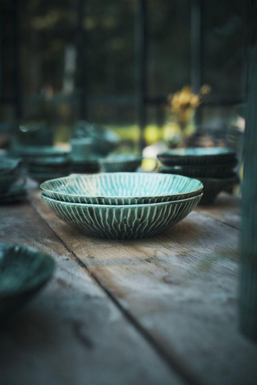 Voor haar nieuwste creatie dook Pascale Naessens niet alleen haar keramiekatelier in, maar ontwierp ze ook een eigen servieslijn: Verde Lanza, exclusief geproduceerd door Serax. De naam verwijst naar Lanzarote, het eiland waar Pascale vaak verblijft en inspiratie vindt. Het diepe, verweerde groen van de houten ramen, deuren en schaarse begroeiing steekt er krachtig af tegen het donkere vulkaanlandschap — precies die sfeer vertaalt zich in het servies. De kleur, perfect passend bij allerlei gerechten, wordt nog versterkt door de schelpachtige textuur die Pascale met de hand aanbracht. Authentiek, zintuiglijk en doordrenkt van zon: helemaal Pascale.