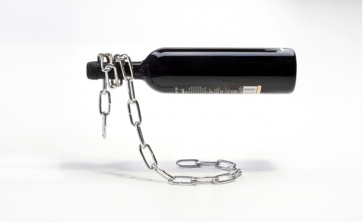 Een ketting die een fles draagt: de Drink Up wijnfleshouder lijkt te tarten met de zwaartekracht. De metalen ketting staat uit zichzelf rechtop en houdt een standaard wijnfles stevig vast. Een opvallend object dat meteen nieuwsgierigheid oproept.