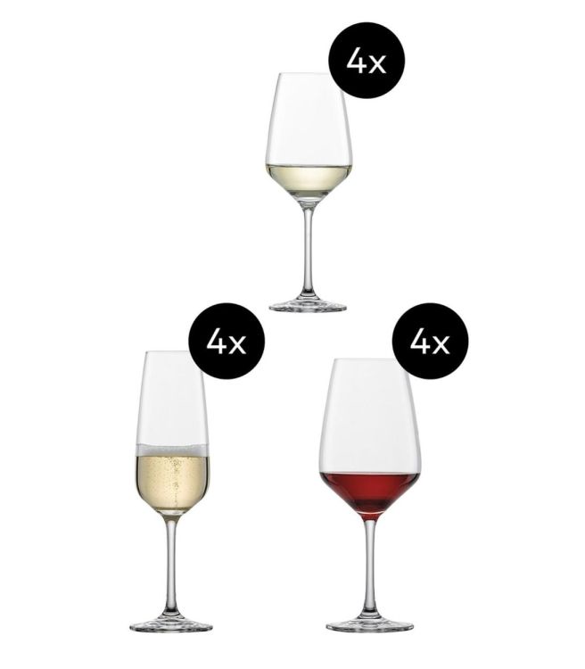 - Aantal: 12 glazen (4 witte wijn, 4 rode wijn, 4 champagne)